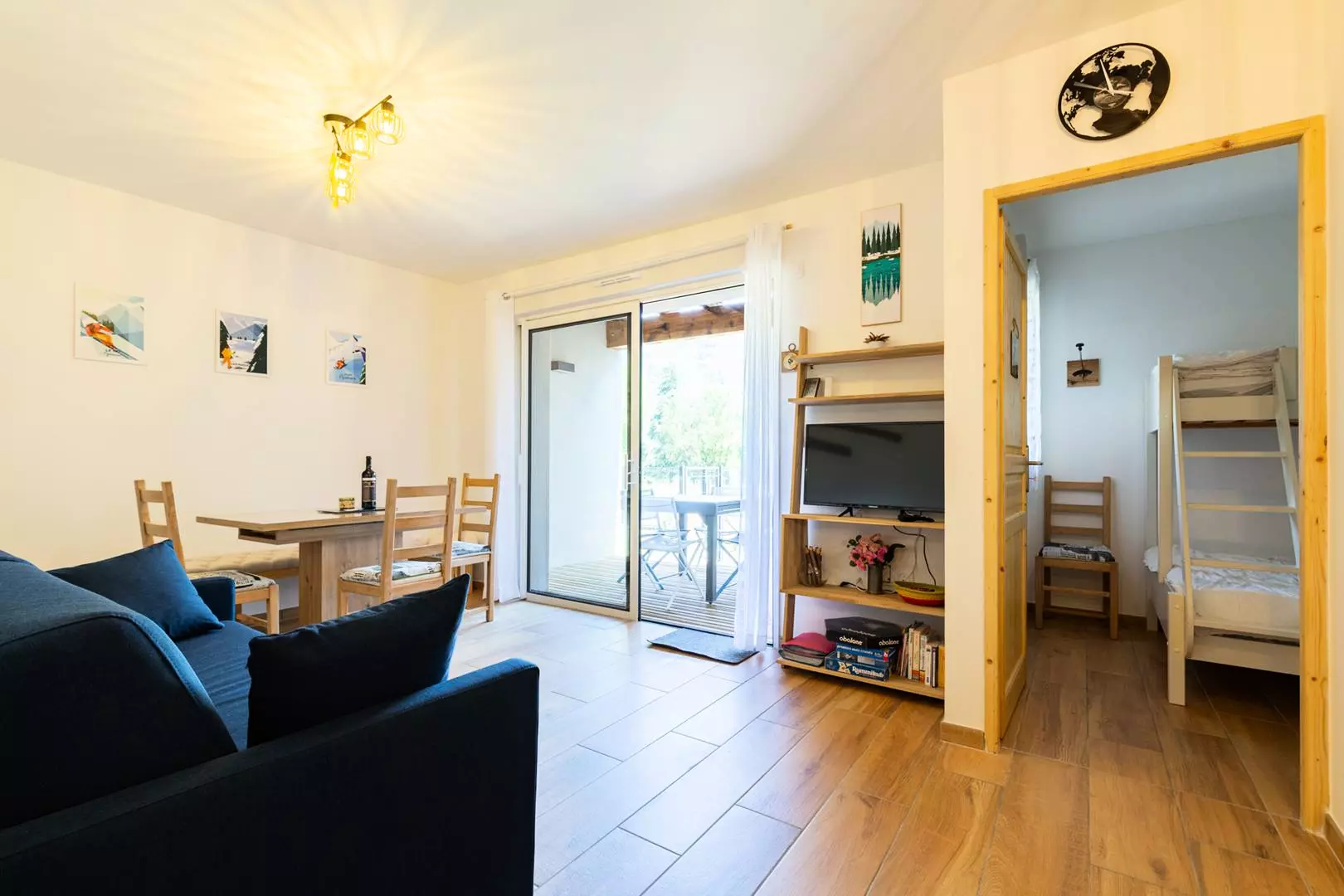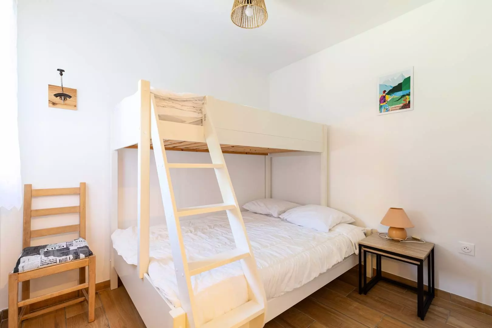 Une chambre avec 1 grand lit et une chambre avec 2 lits superposés