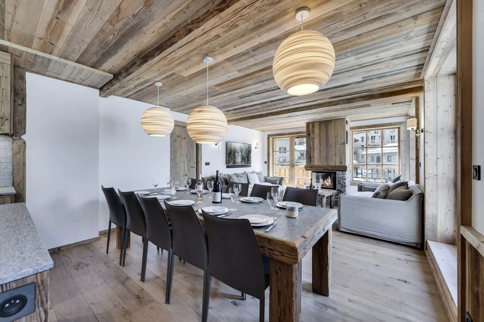 - Salon avec cheminée, TV connectée, cuisine ouverte entièrement équipé avec un îlot central.