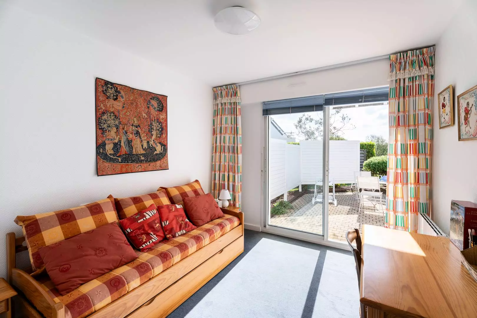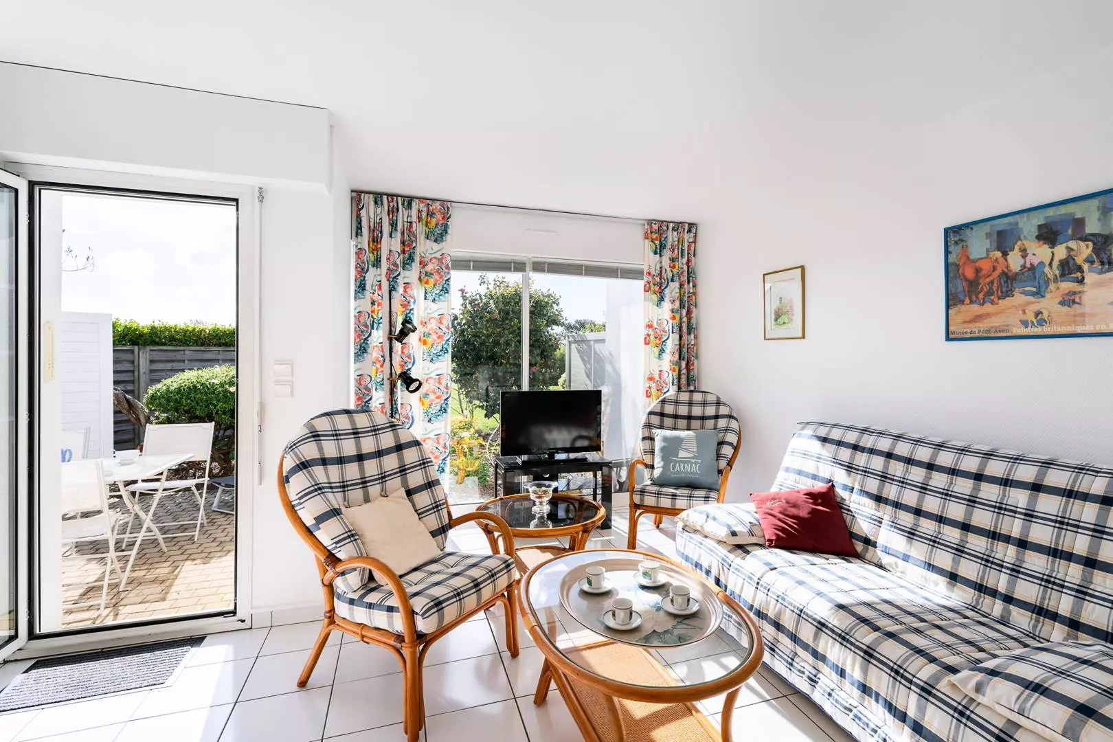 - Beau séjour avec partie repas (table et chaises) et partie salon (TV, fauteuils, canapé convertible clic-clac : 2 personnes, couverture) donnant sur la terrasse exposée Sud-Est (meubles de jardin) et avec vue sur le jardin de la résidence