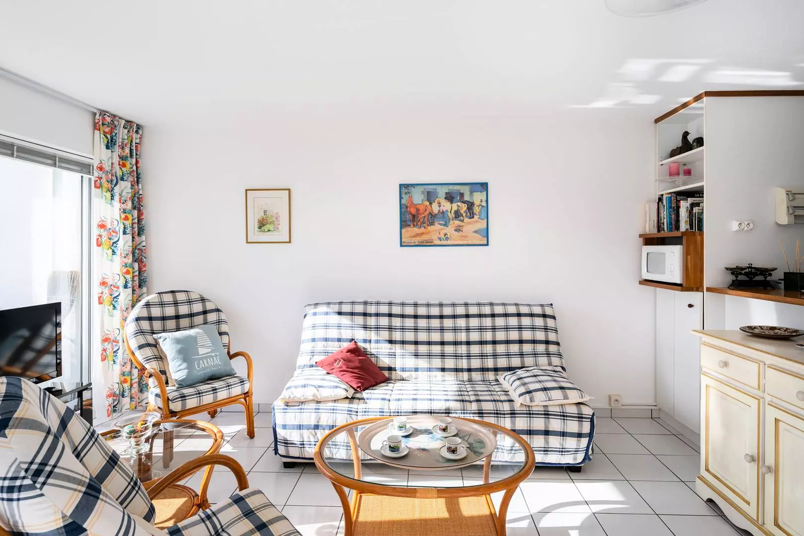 - Séjour avec partie repas (table et chaises) et partie salon (TV, canapé clic-clac : couchage 2 personnes, couverture) donnant sur balcon exposé Sud-Est (meubles de jardin) avec vue sur la piscine et le jardin de la résidence