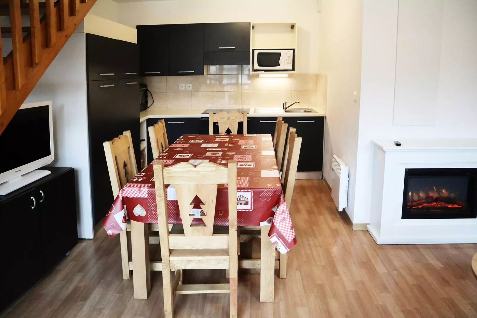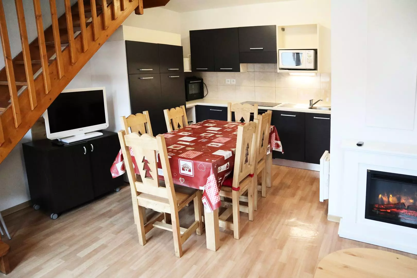 Rez de chaussée : une entrée, un séjour avec une banquette convertible deux places, un coin cuisine ouvert sur le séjour, Wc, un balcon offrant une vue sur les pistes.
