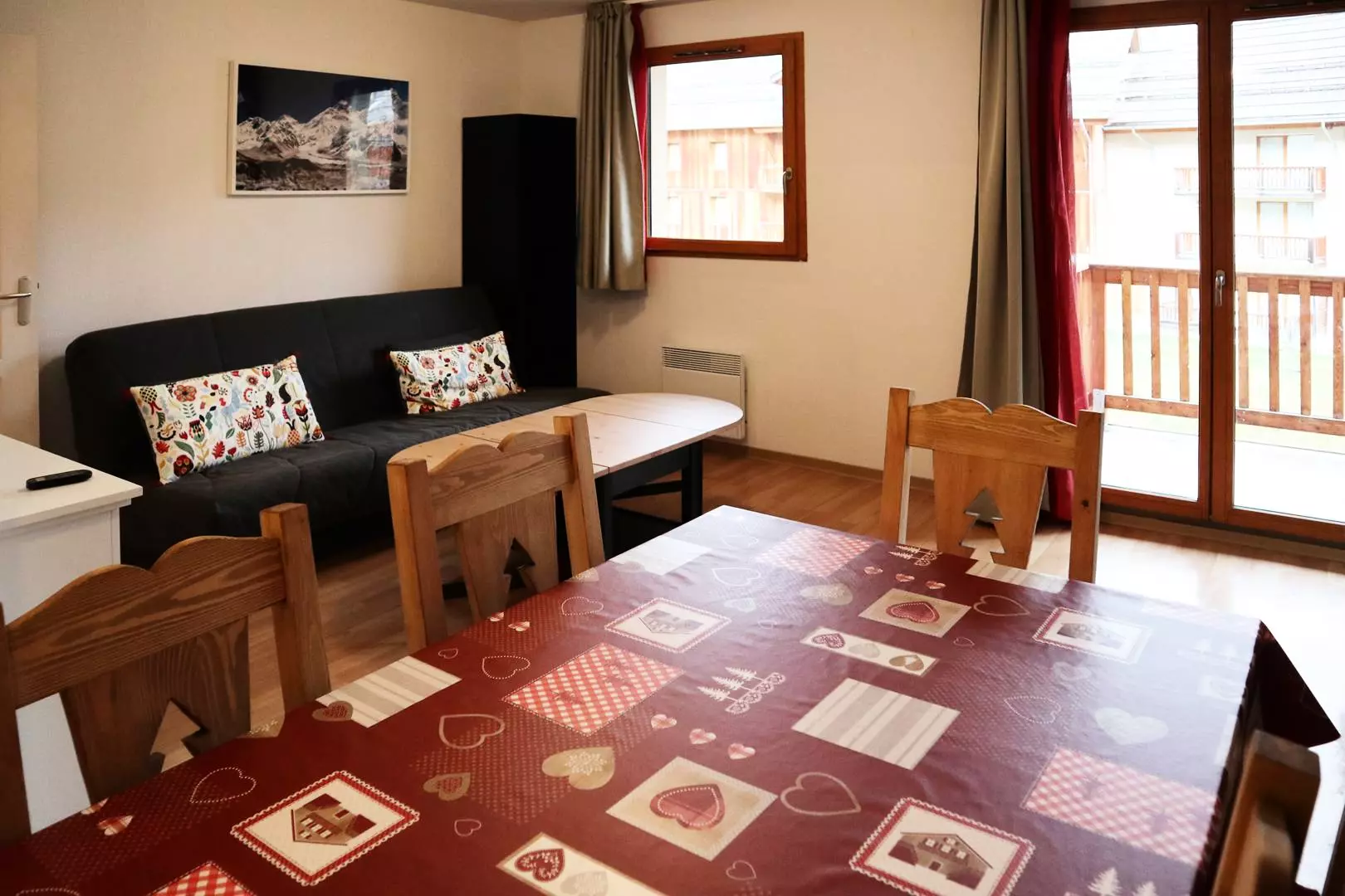 Rez de chaussée : une entrée, un séjour avec une banquette convertible deux places, un coin cuisine ouvert sur le séjour, Wc, un balcon offrant une vue sur la montagne.