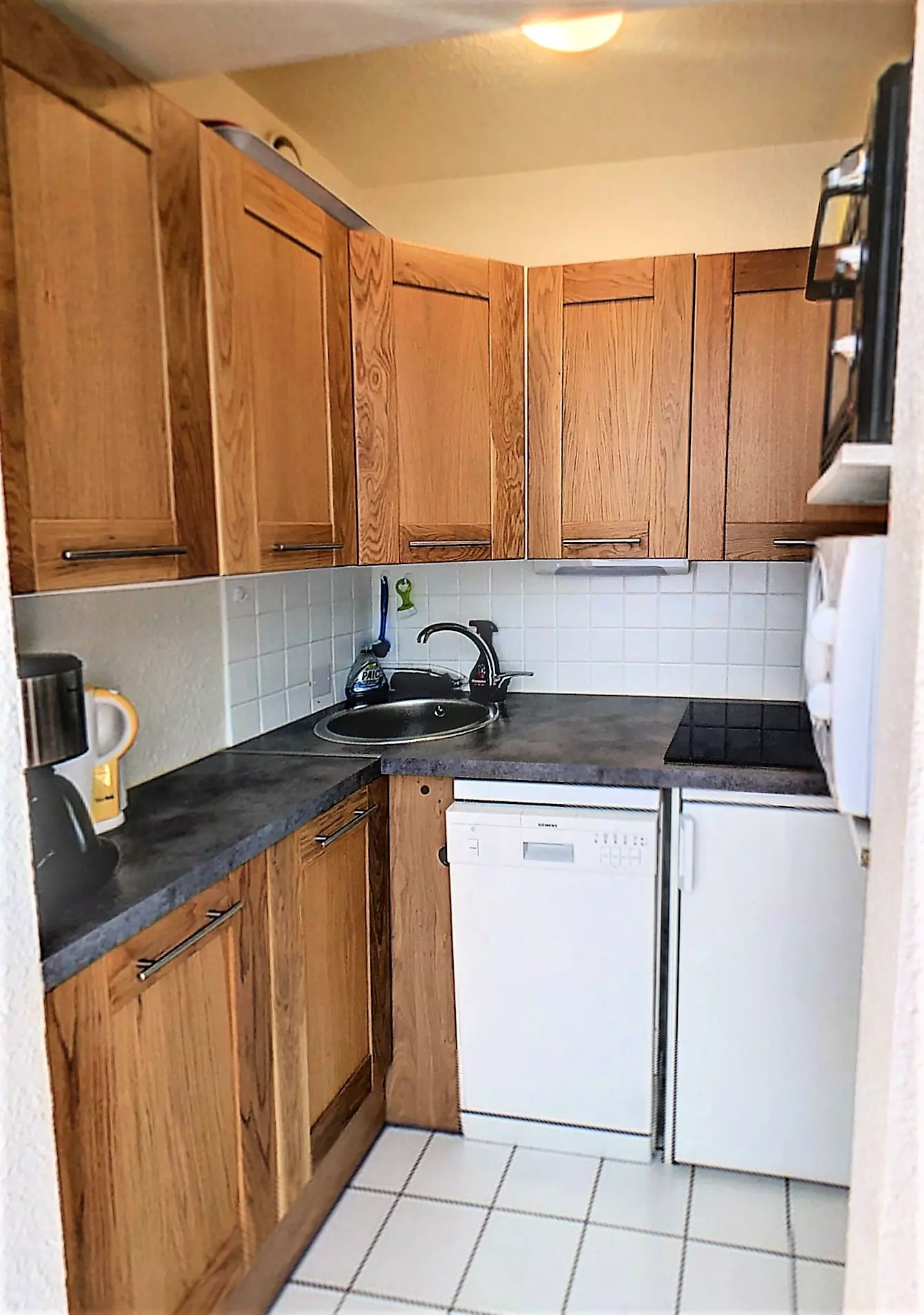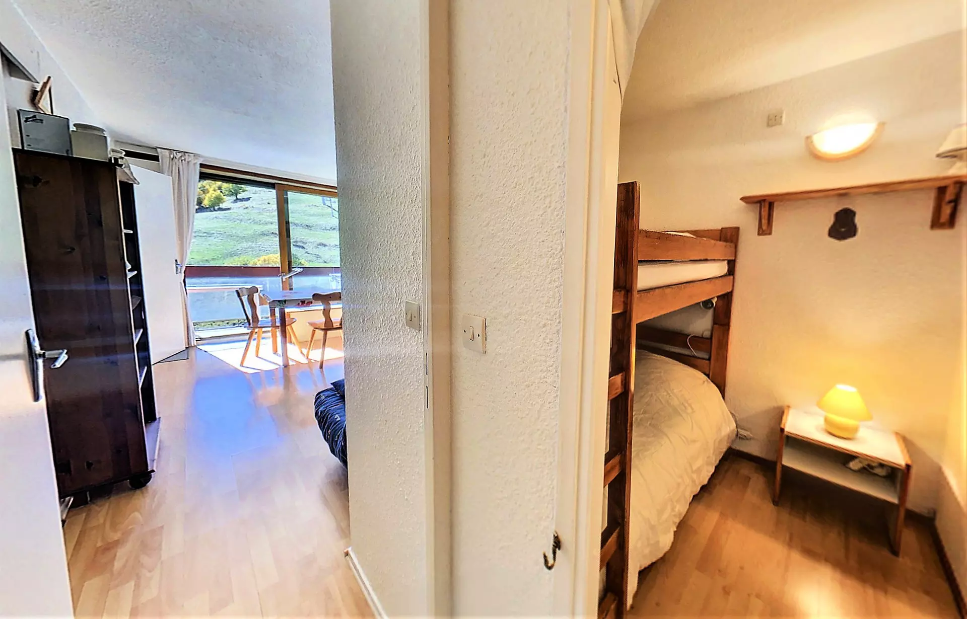 Bel appartement comprenant une entrée avec un grand rangement, salle de bains, wc séparés, un coin montagne avec lits superposés, fermé par un rideau, un coin cuisine entièrement rénové et équipé avec, plaques vitro, Lave vaisselle, mini four, micro ondes, cafetière filtre. Le séjour est équipé d'1 clic clac en 140 pour 2 personnes, TV, une belle table pouvant accueillir 6 convives et une chambre avec 1 lit en 140 et petit dressing.