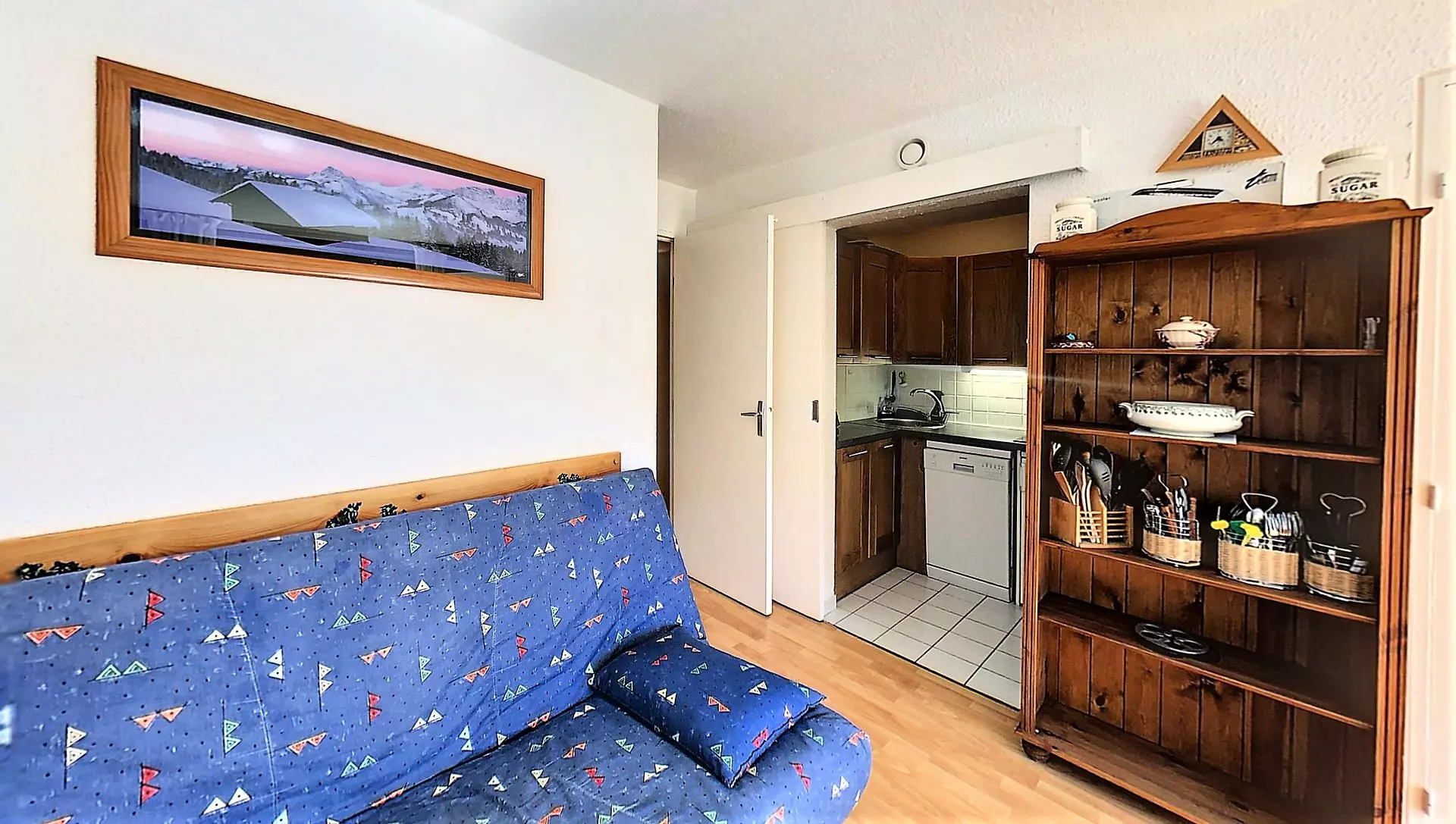 Appartement bien entretenu, comprenant une entrée avec placard, un séjour équipé d'1 canapé clic-clac double avec un meuble de rangement au dessus, 1 lit simple rabattable, ainsi qu'une télévision.