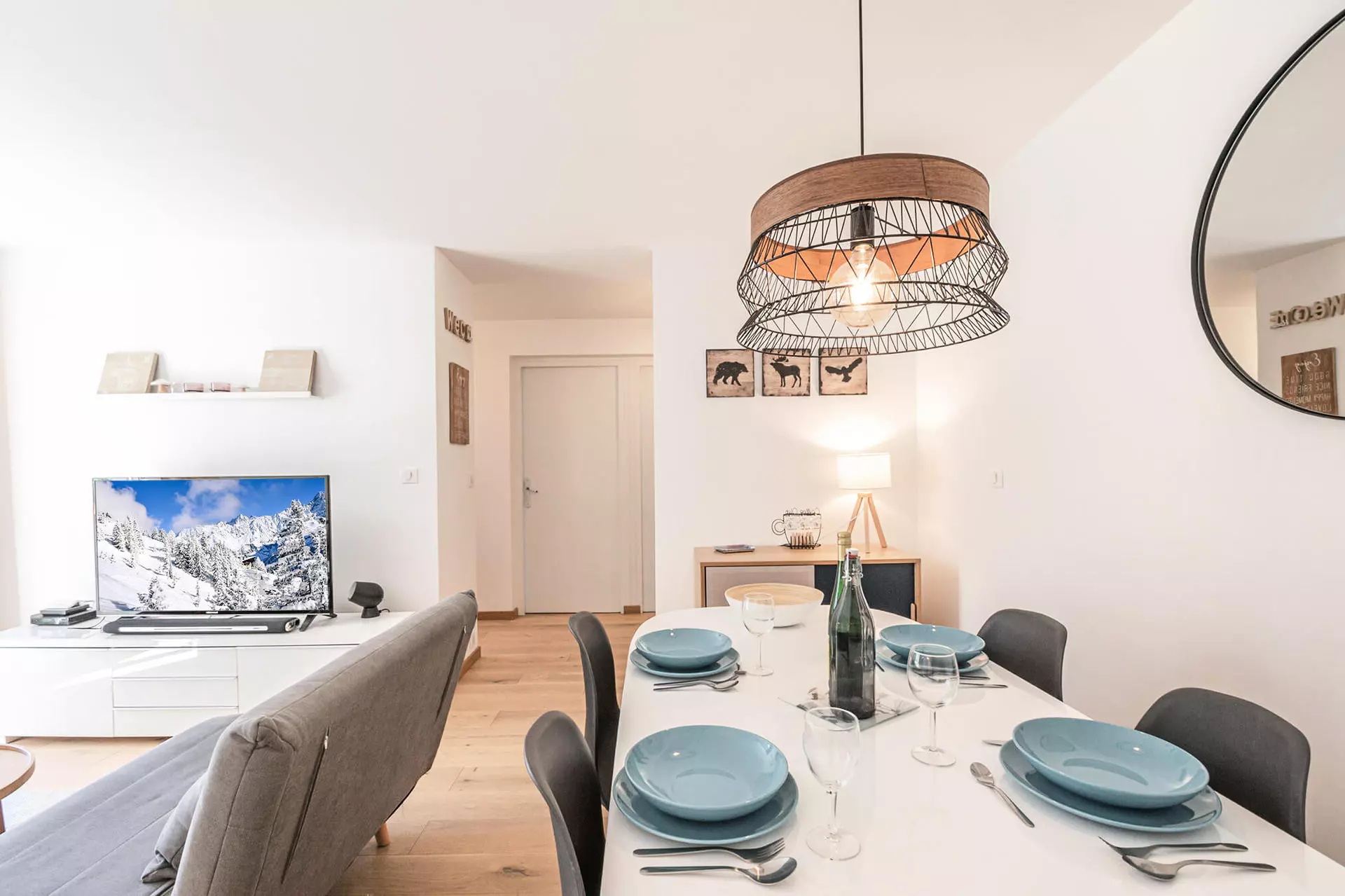 - Salon / salle à manger avec TV, barre de son, canapé lit double (140x190)