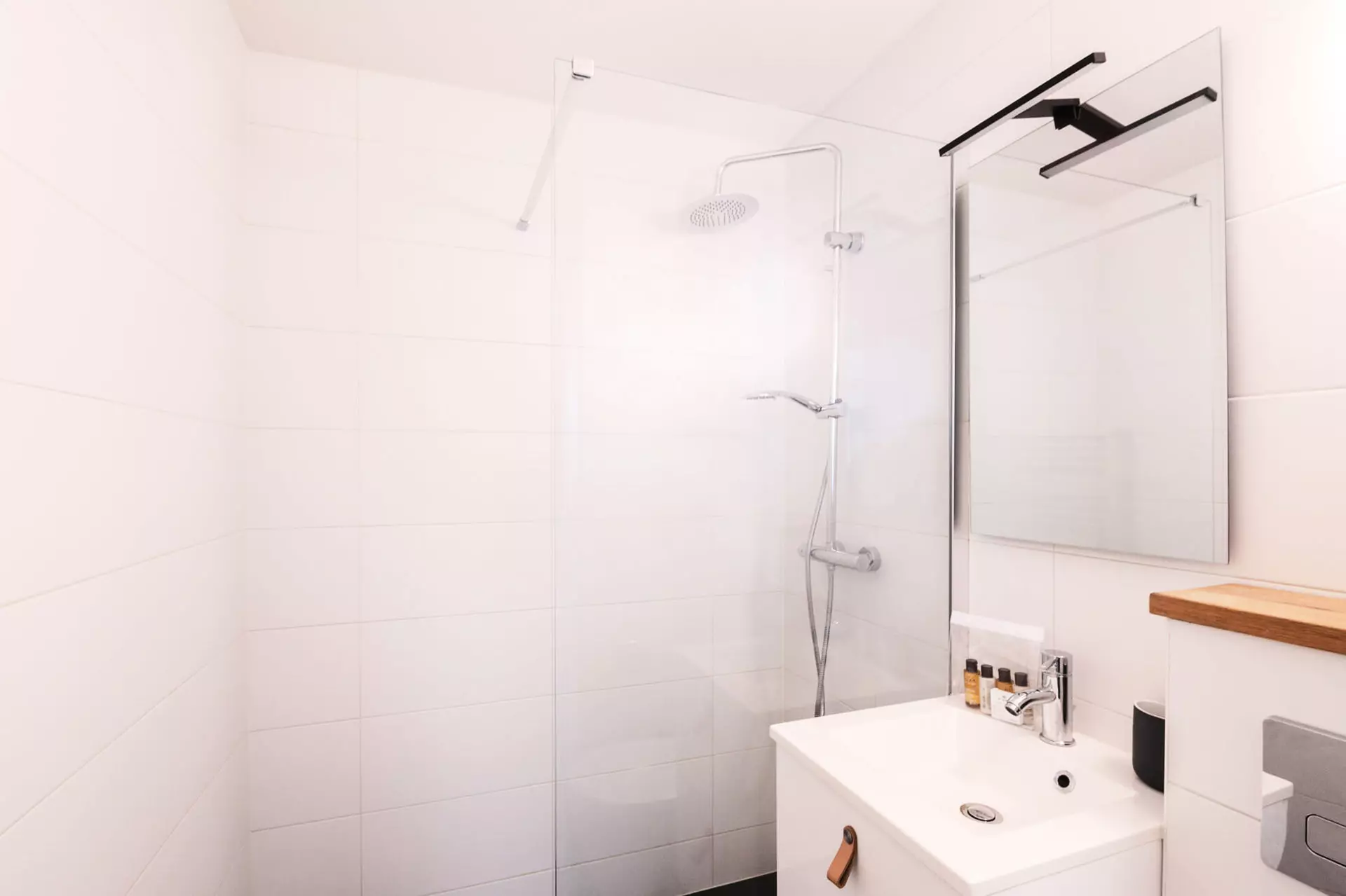 - Salle de douche avec sèche serviette, toilettes et lave-linge