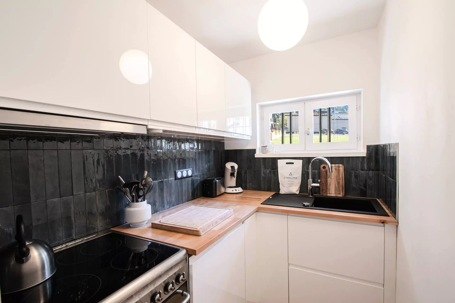 - Cuisine équipée (plaques vitrocéramiques, réfrigérateur, freezer, four, hotte, grille-pain, cafetière filtre, cafetière Senseo, appareil à raclette).