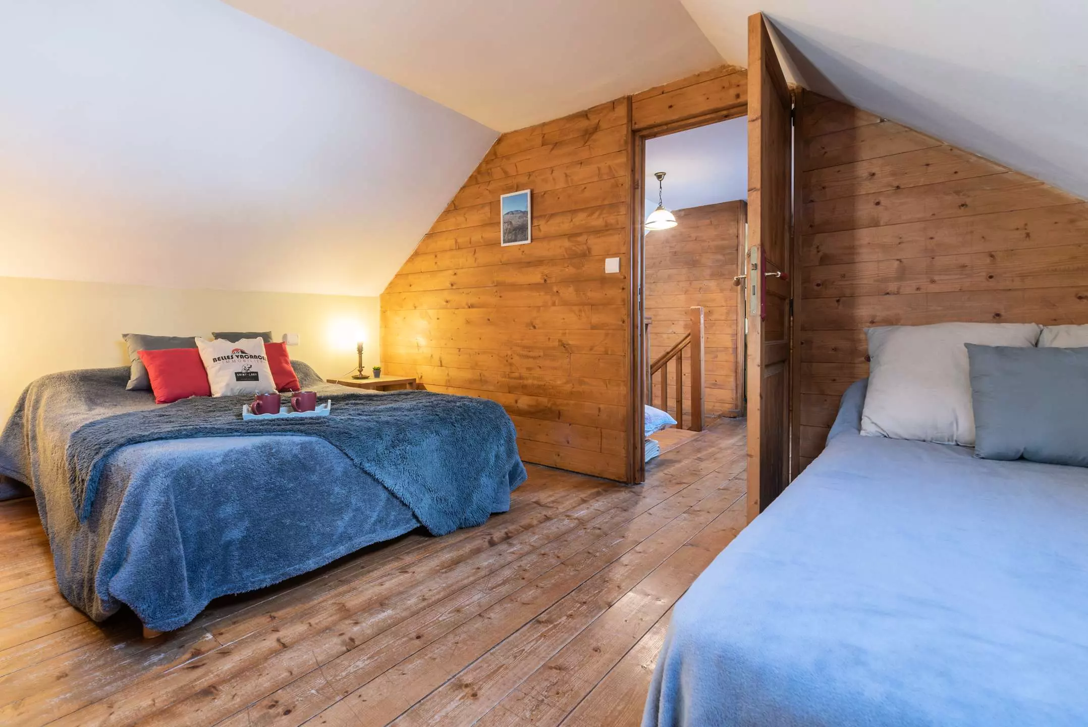A l'étage, vous trouverez un palier avec un couchage simple,un suite parentale avec un grand lit et un petit lit et sa salle de bain privative, une grande chambre avec un grand lit et un petit lit. Une salle de bains supplémentaire est à votre disposition.