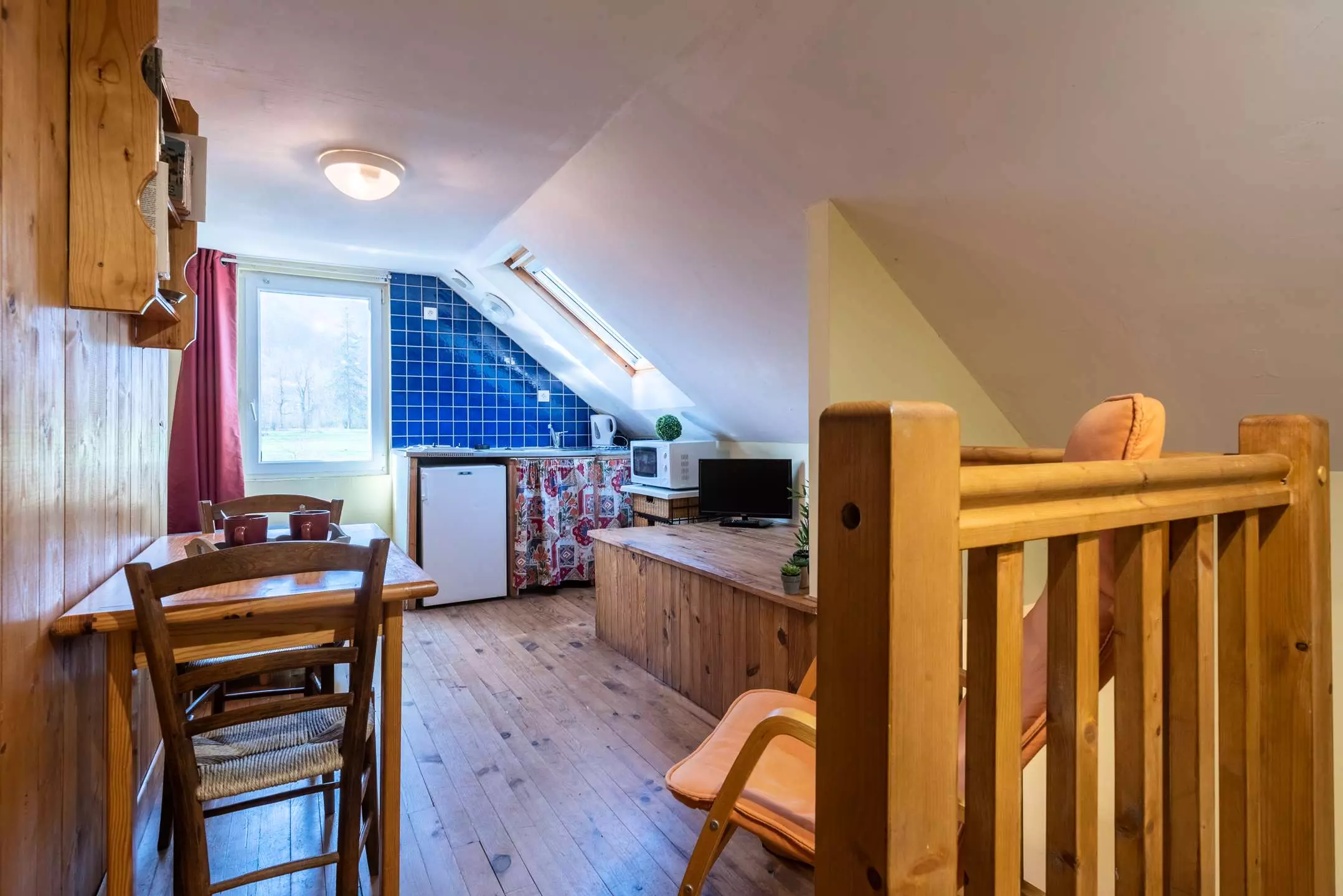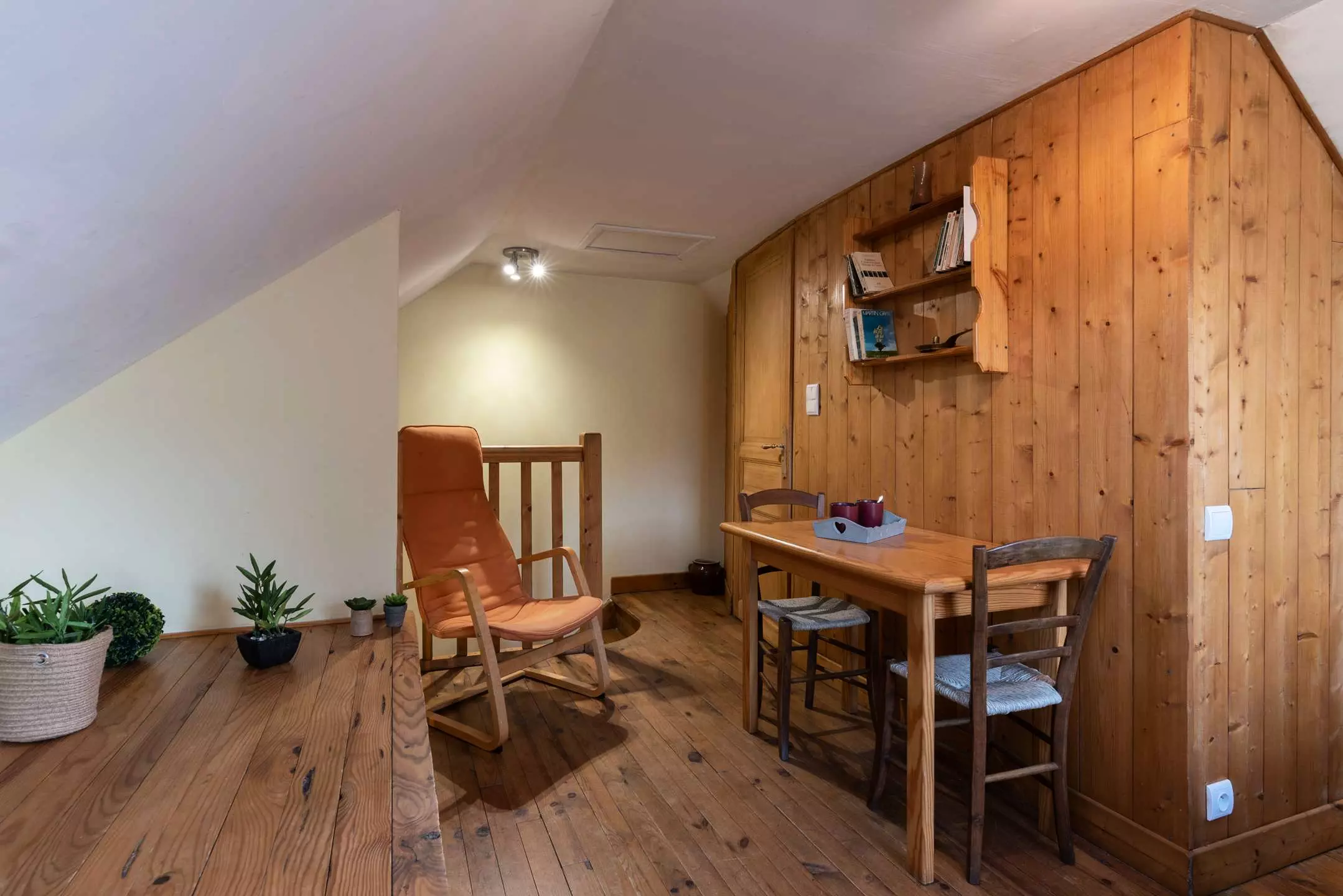 La première partie, en duplex, dispose , au rez de chaussée, d'une cuisine équipée, et un grand salon/salle à manger avec une grande cheminée non fonctionnelle pour les soirées coocooning!