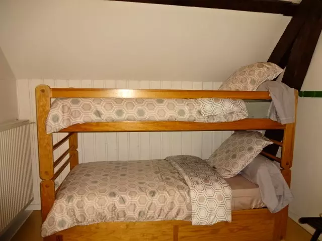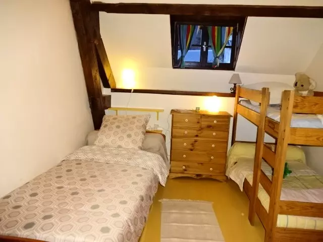 A l'étage, 4 chambres, 1 avec 1 lit en 140 et velux, 1 avec 1 lit en 140 et une capucine et 2 x lits superposés et 1 lit pour 1 personne et fenêtre et 1 avec lit en 160 et 1 lit en 90 avec porte fenêtre.Salle de bain et wc séparés.