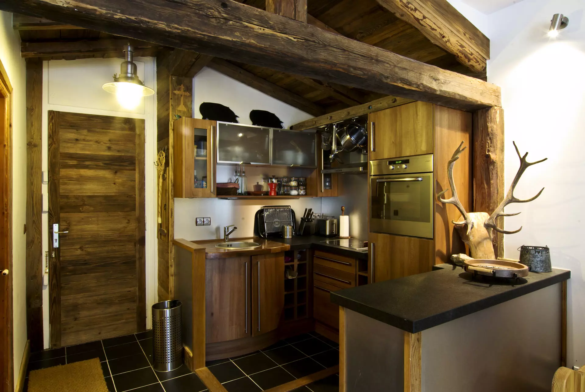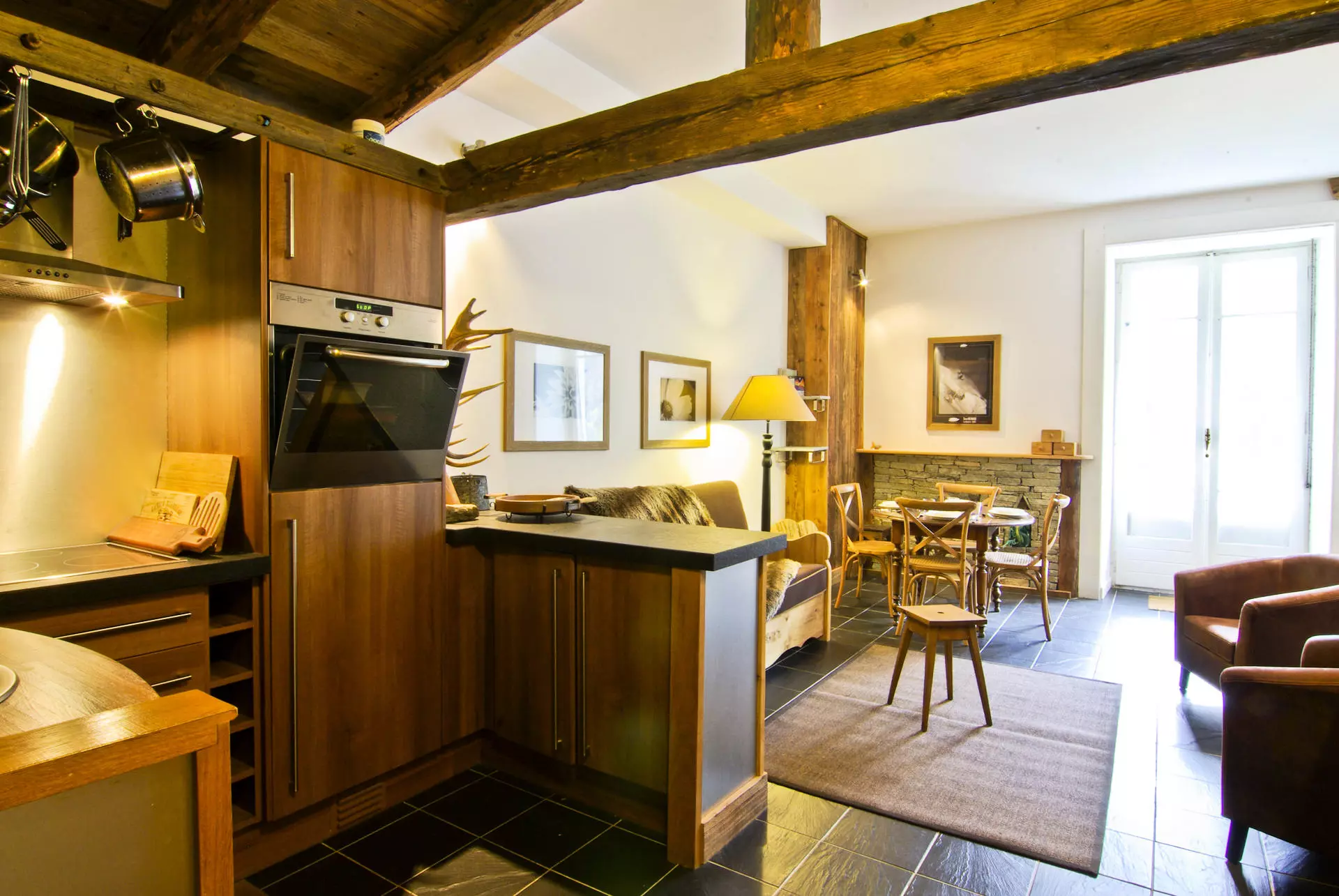 - Coin cuisine équipée (four, réfrigérateur, plaques vitrocéramiques, lave-vaisselle et hotte, cafetière italienne, cafetière à piston, grille-pain, appareil à fondue)