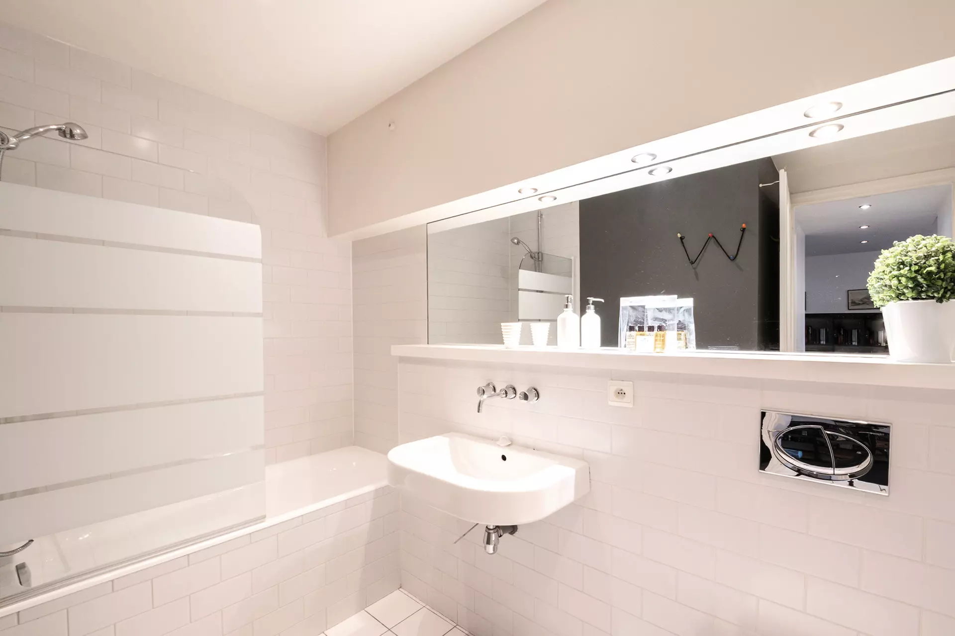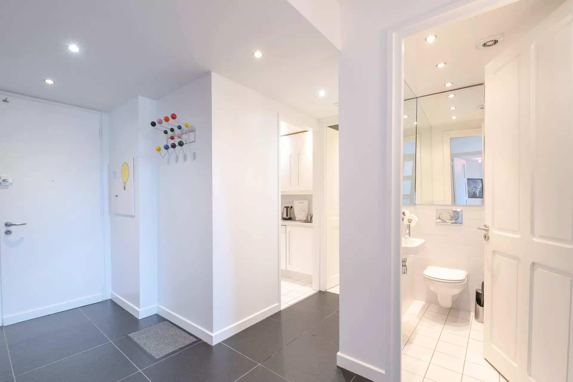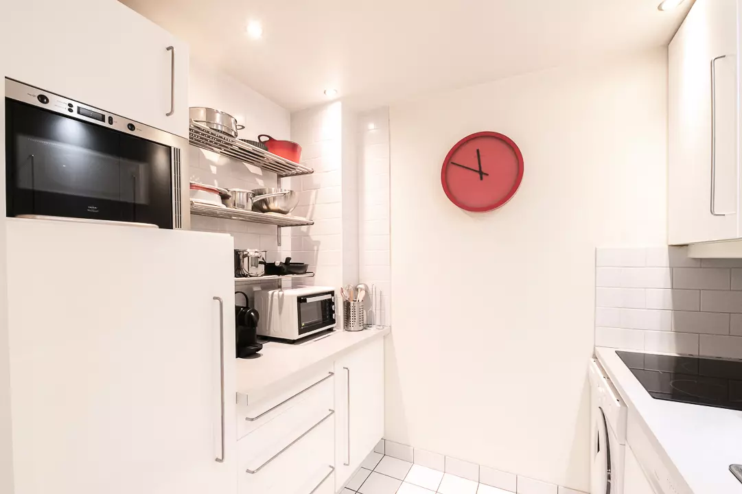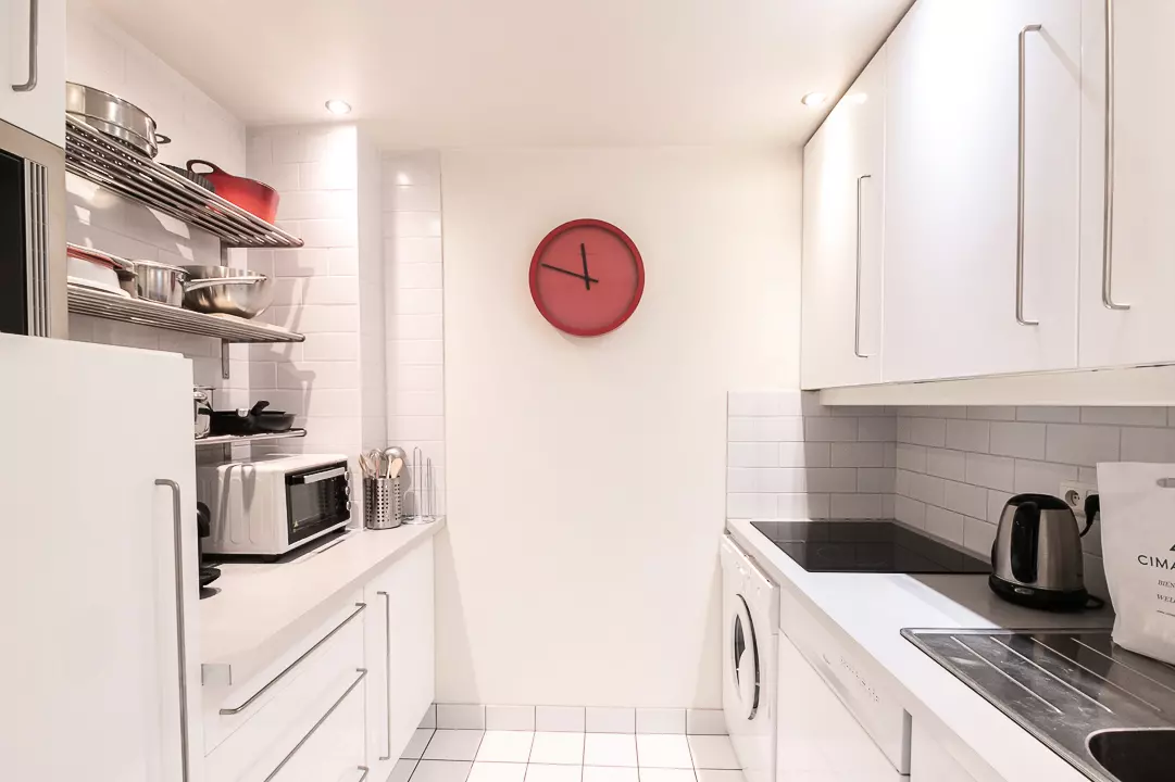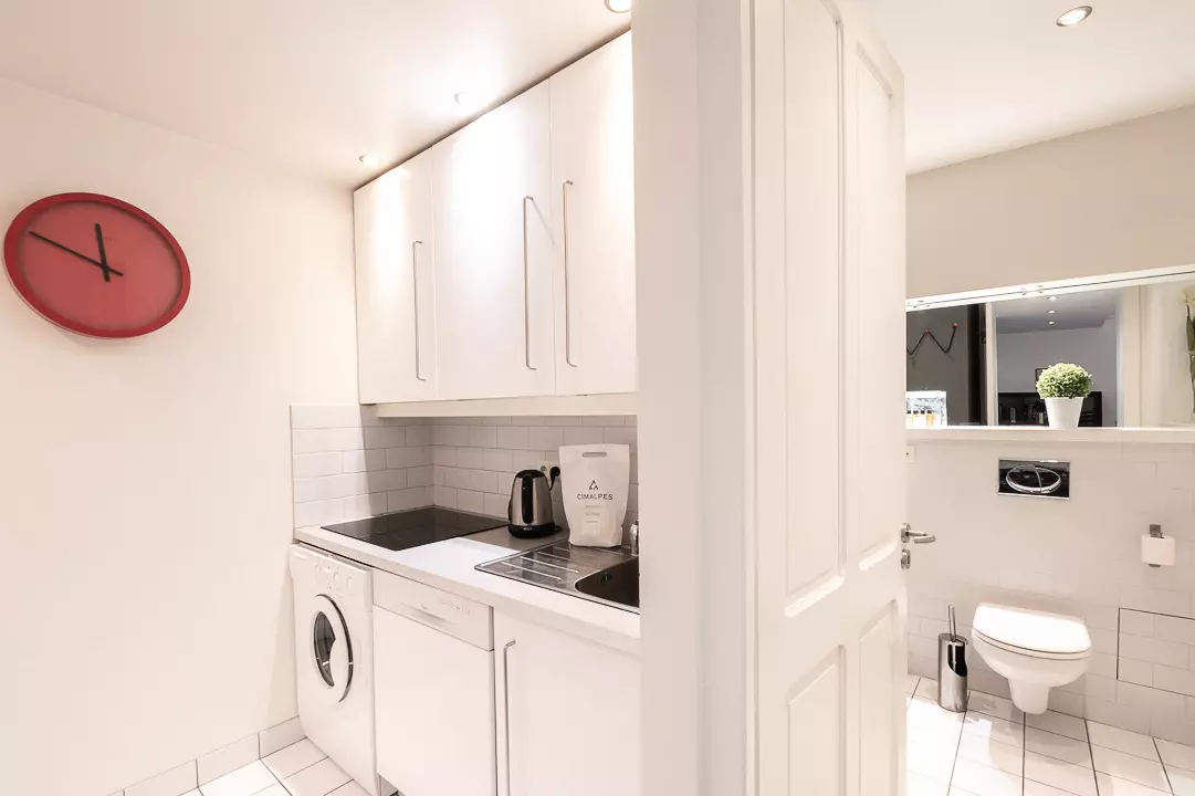 - Cuisine séparée équipée (plaques à induction, réfrigérateur avec compartiment freezer, micro-ondes, mini-four, lave-linge et lave-vaisselle, Nespresso, bouilloire, grille-pain)
