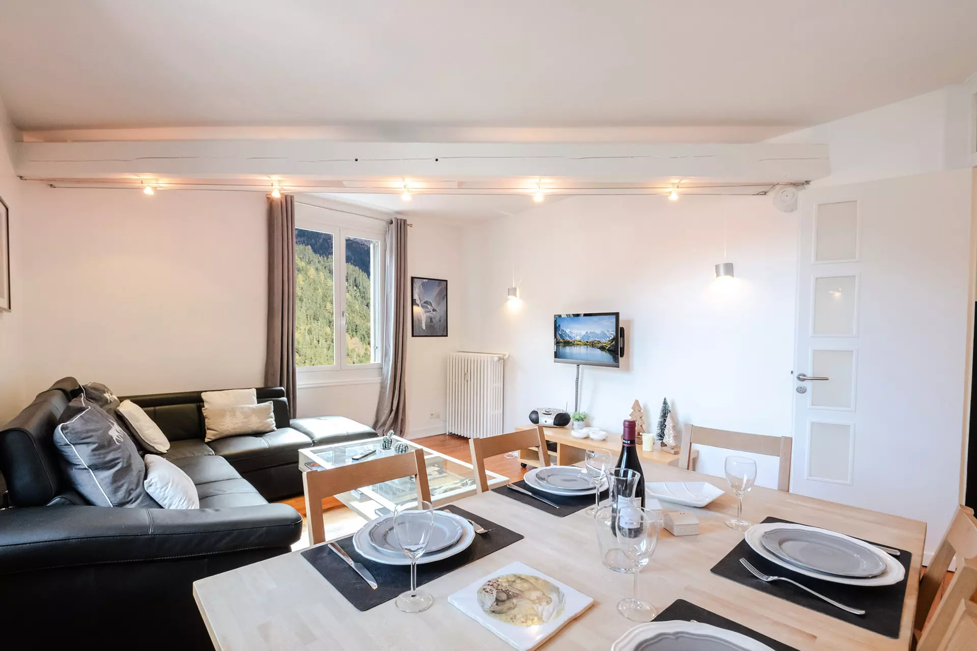 - Salon / salle à manger avec TV et canapé lit simple (Vue sur le Mont-Blanc, les Aiguilles de Chamonix et le Tour).