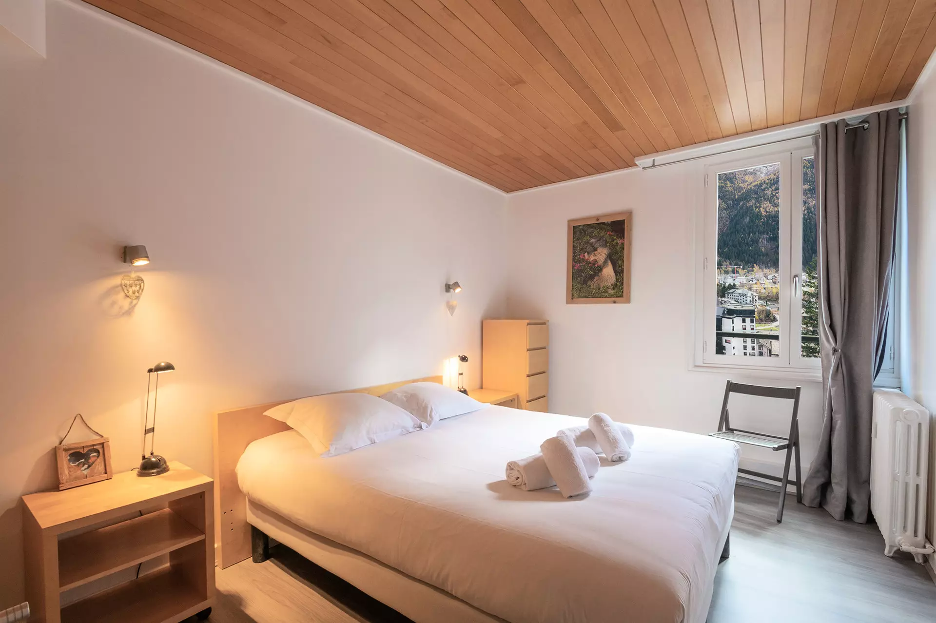 - Une grande chambre ouverte avec un lit double (160x190), balcon, vue sur la chaine du Mont Blanc