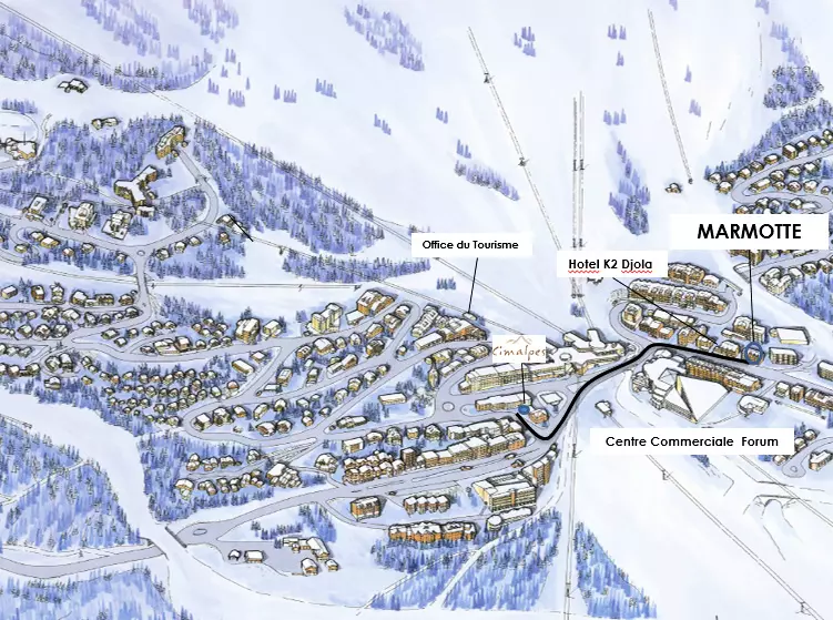 La résidence Marmottes est située en plein dans le centre de Courchevel 1850. Elle est à proximité de l'Ecole de Ski Français, du jardin des enfants et de plusieurs restaurants locaux. Son emplacement est idéal, étant à mi-chemin entre les commodités du centre et l'accès aux pistes.