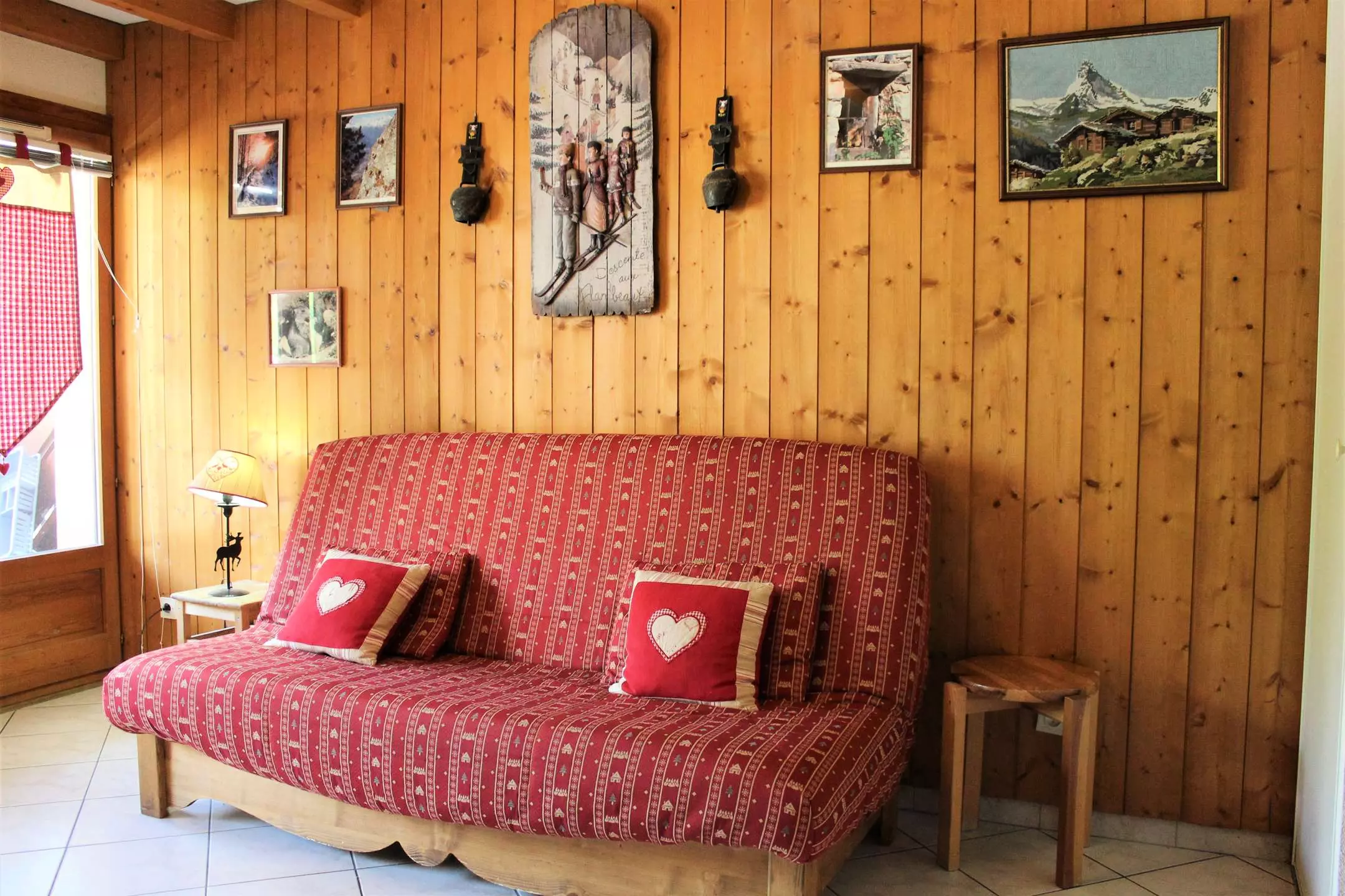 Cet appartement à la montagne se compose d'un coin cuisine équipé et d'un séjour avec un canapé convertible deux places. Il comprend une chambre avec un lit double et d'un coin montagne avec deux lits superposés une place. Vous disposez d'une salle de bains avec baignoire et d'un WC séparé.
