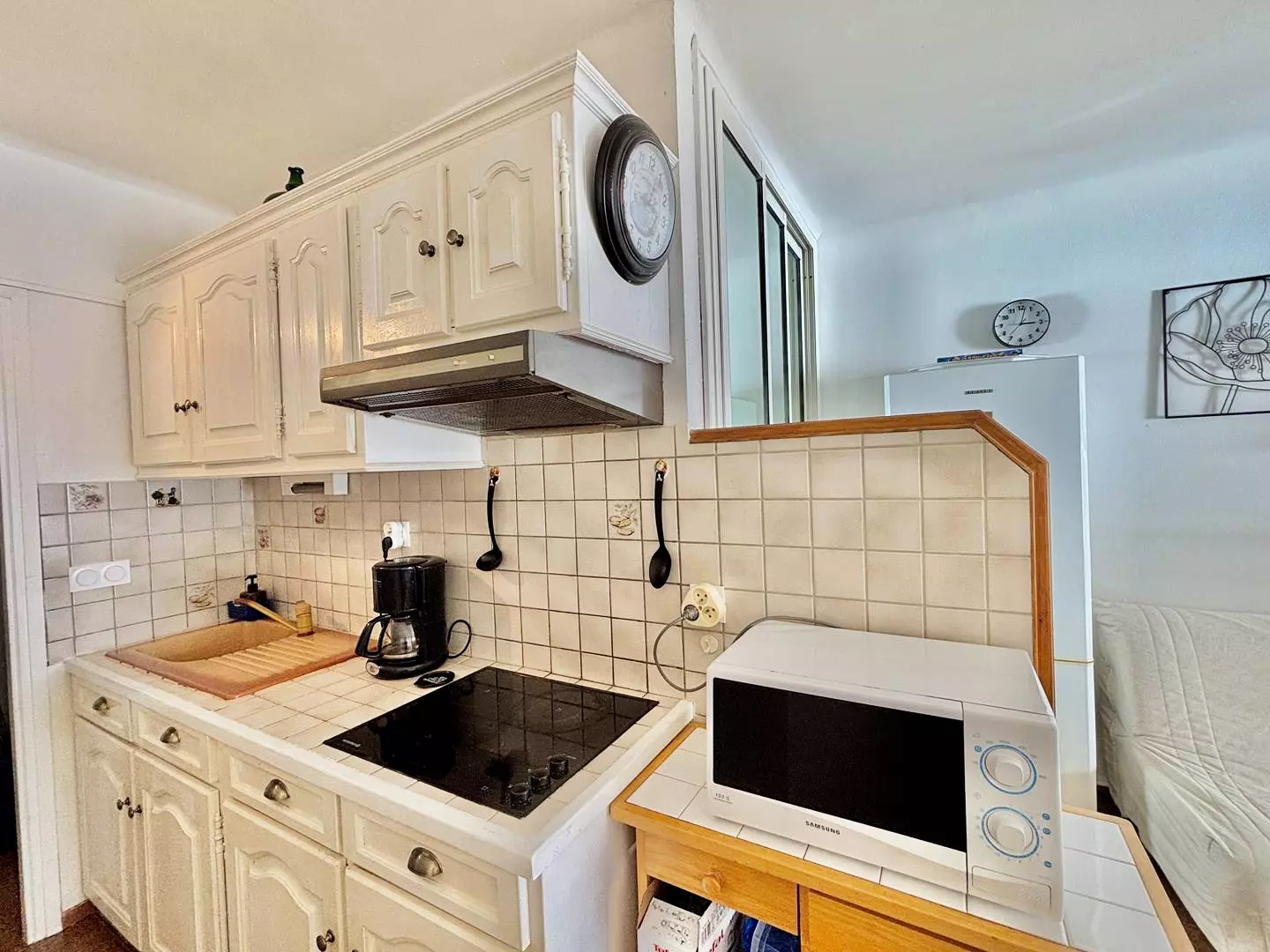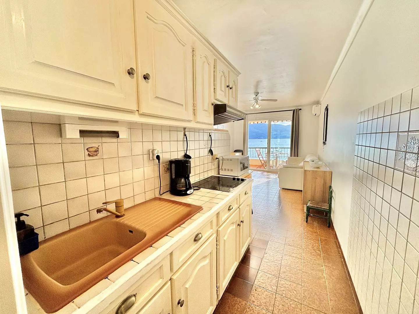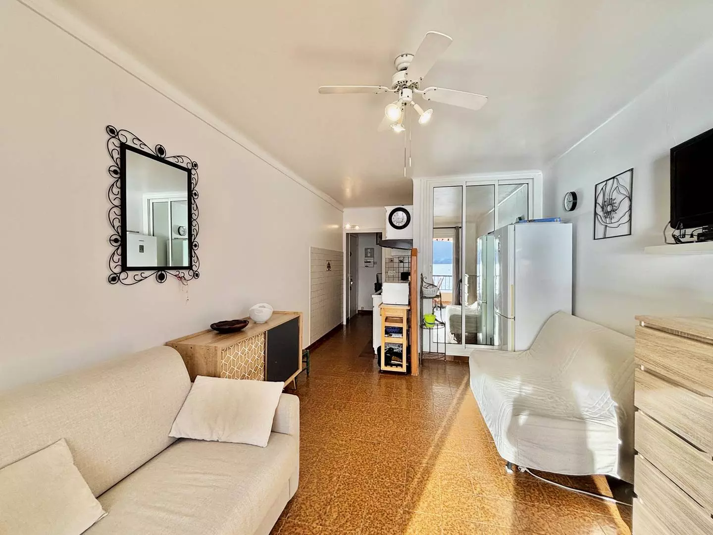 L'appartement, de type studio comprend : une entrée, une salle d'eau avec douche wc et lave-linge, un espace de vie avec une grande cuisine équipée et un canapé convertible, une télévision, le tout donnant sur la petite terrasse vue mer imprenable.