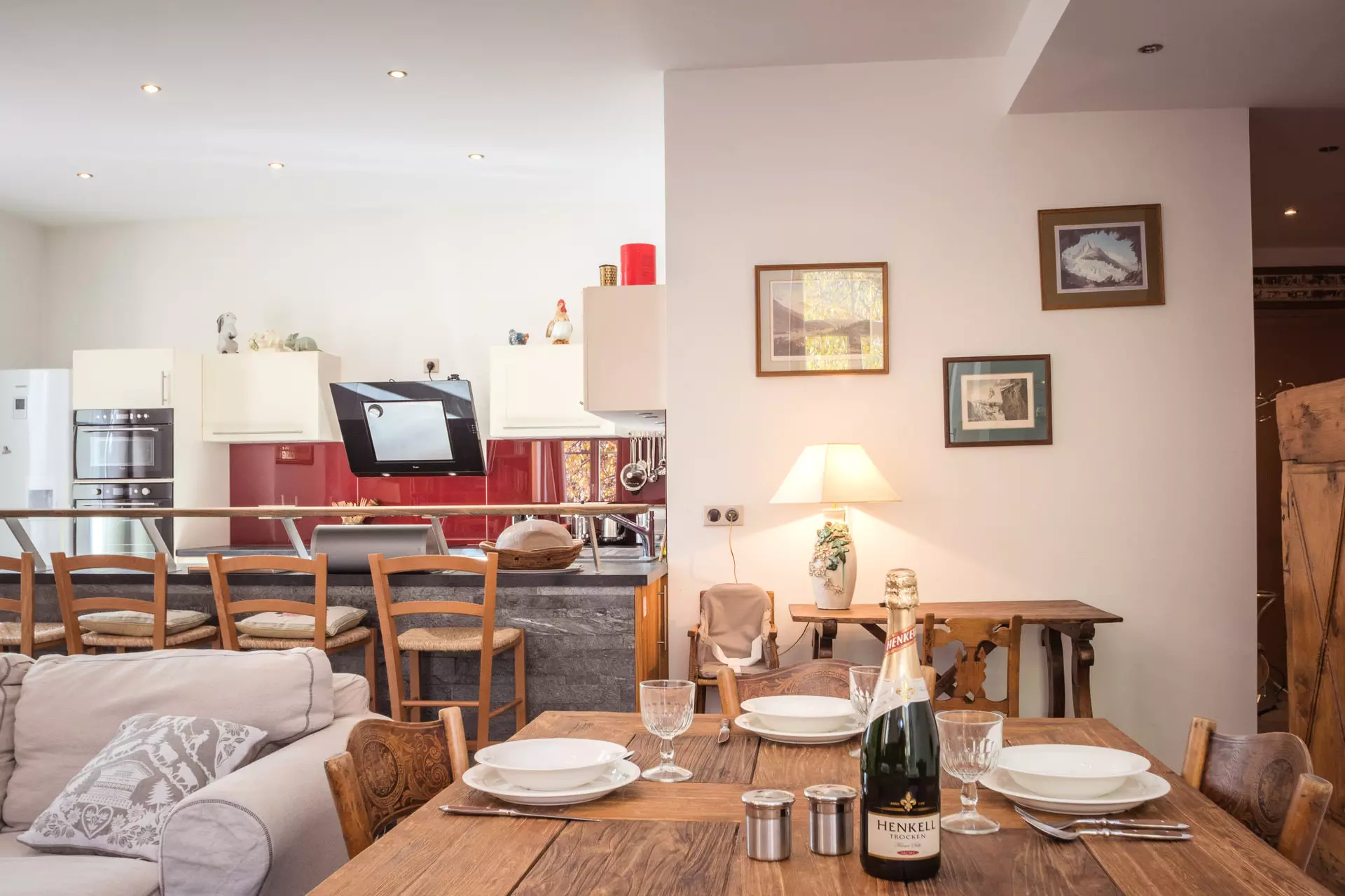 - Grande cuisine ouverte équipée (four, réfrigérateur, micro-ondes, plaques à induction, hotte, lave-vaisselle, bouilloire, Nespresso, cafetière à piston)