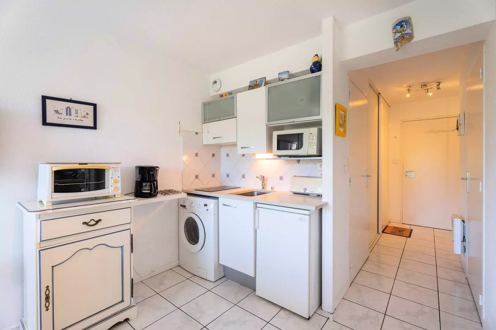 - Coin cuisine ouvert et équipé (plaque induction 3 feux, lave-linge, réfrigérateur avec freezer, micro-ondes, mini-four)