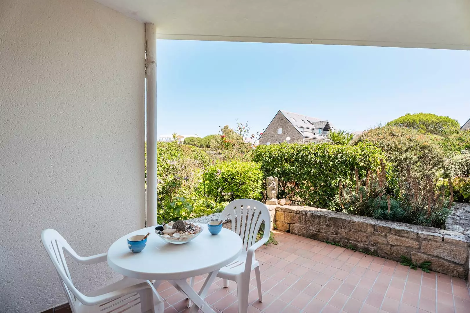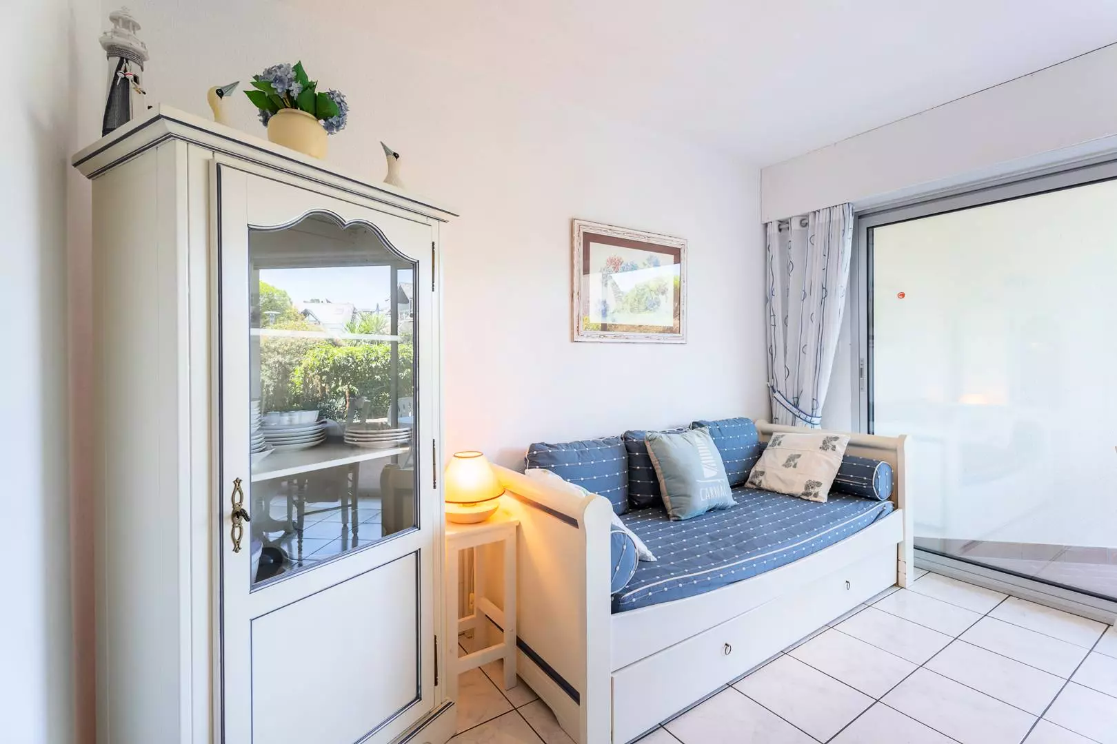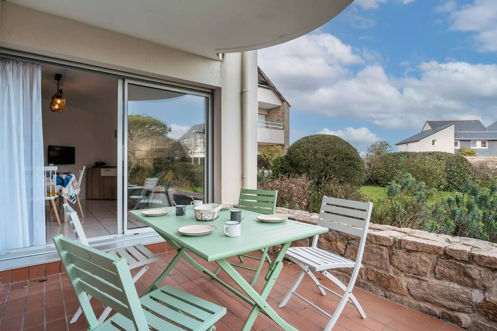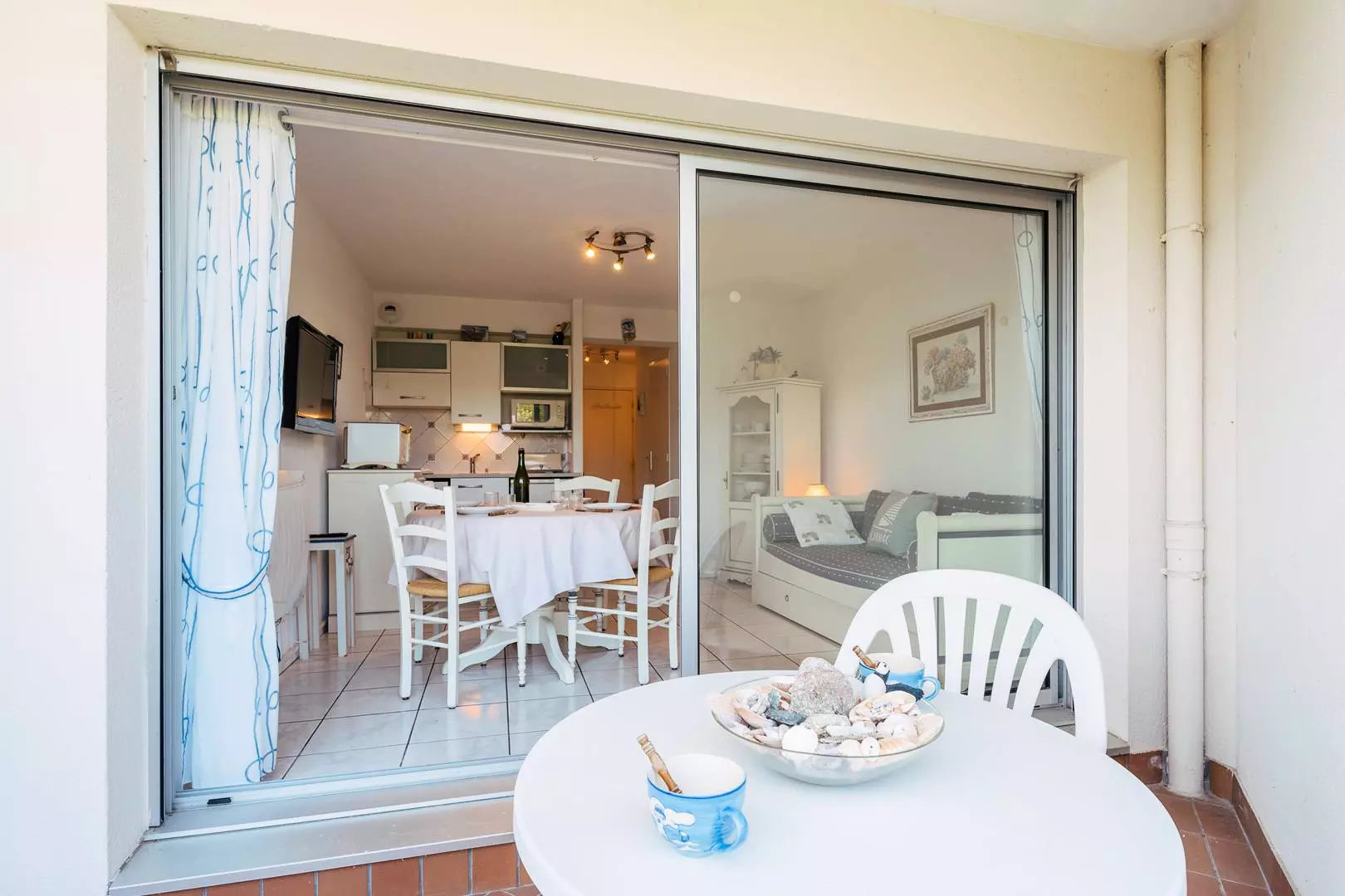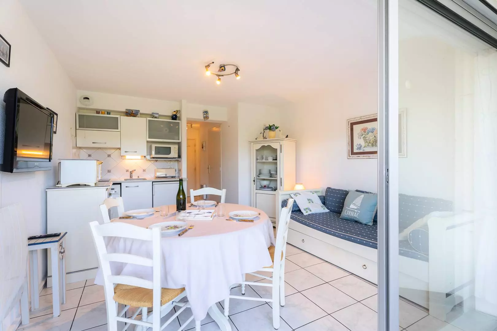 - Séjour avec partie salon : TV, canapé-lit gigogne (2 lits de 80, couvertures) et partie repas (table et chaises) donnant sur une terrasse exposé Est (mobilier de jardin)