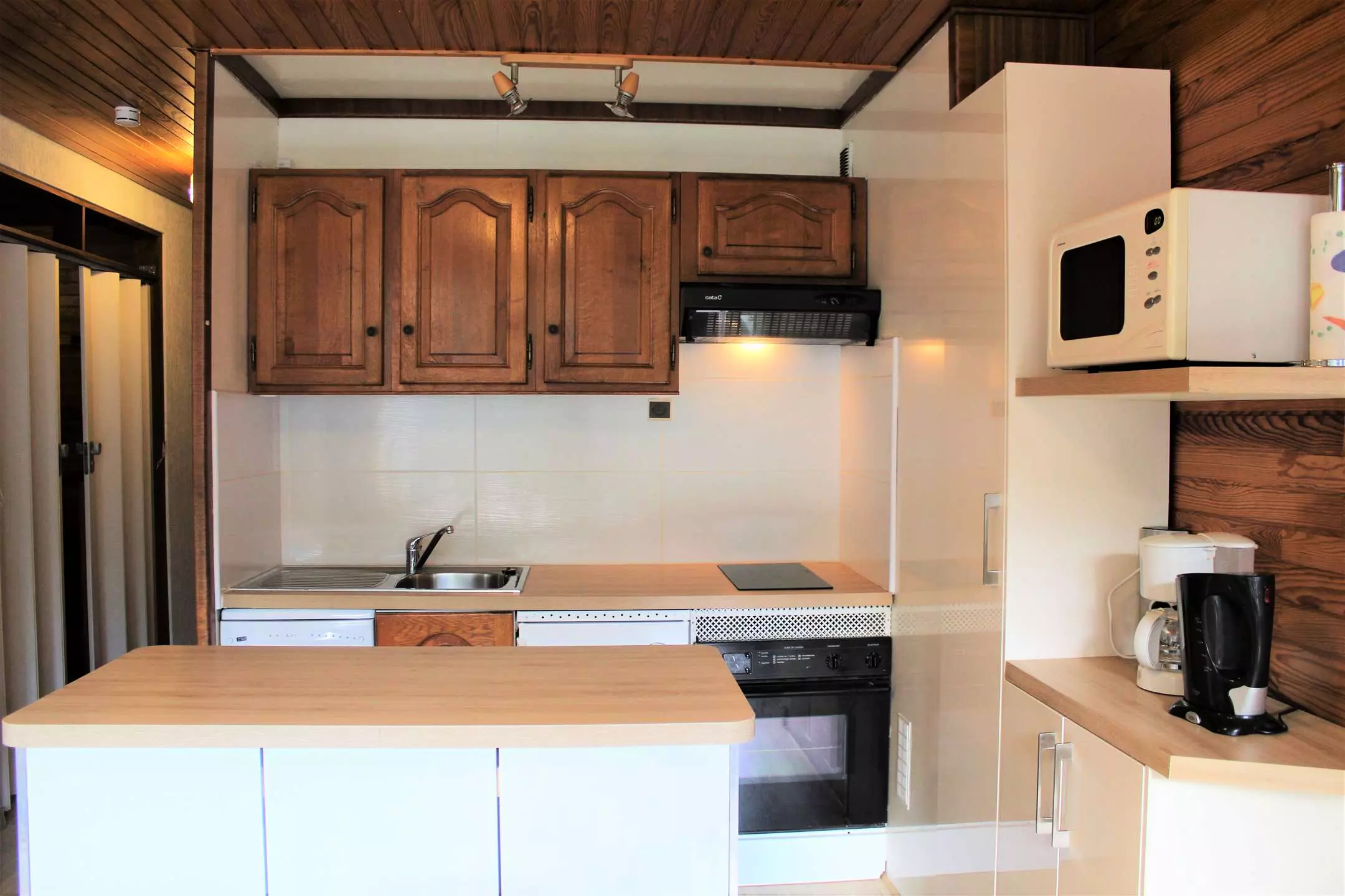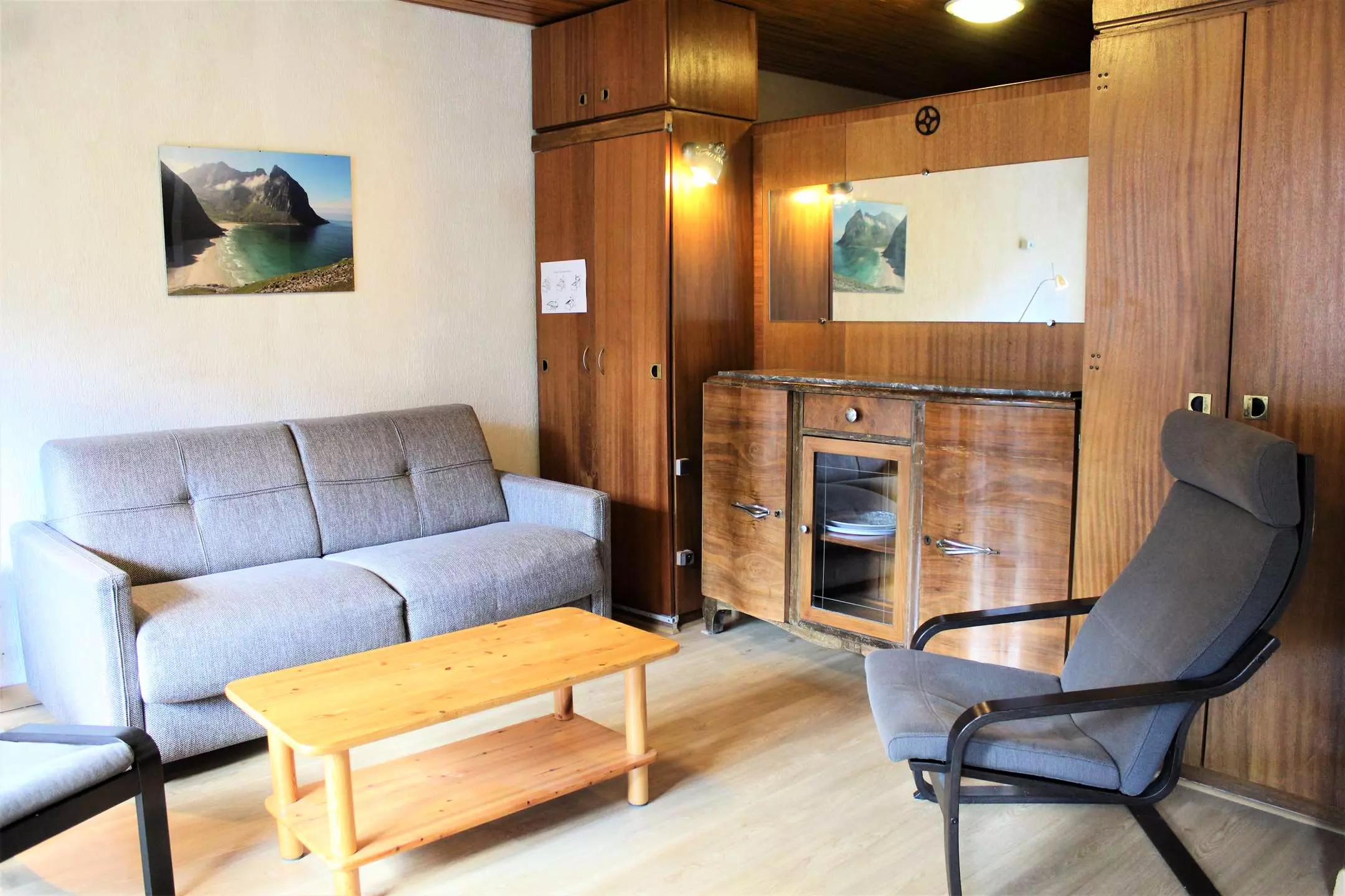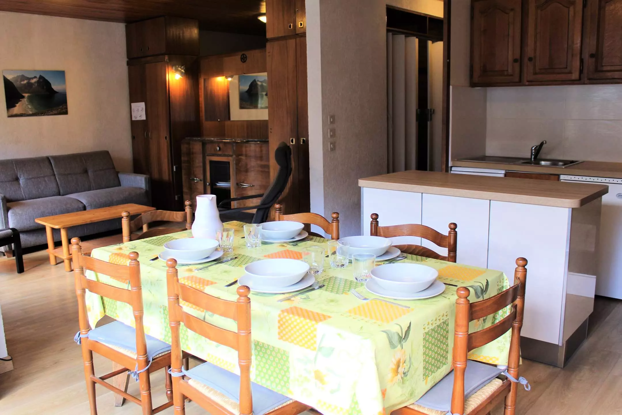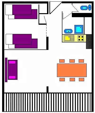 Cette location vacances se compose d'un coin cuisine équipé ouvert sur un séjour disposant d'un canapé convertible rapido pour deux personnes. Vous trouverez dans le coin cabine des lits superposés une place offrant le couchage pour quatre personnes (séparation avec porte accordéon). L'appartement dispose d'une salle d'eau avec une douche et des WC séparés.