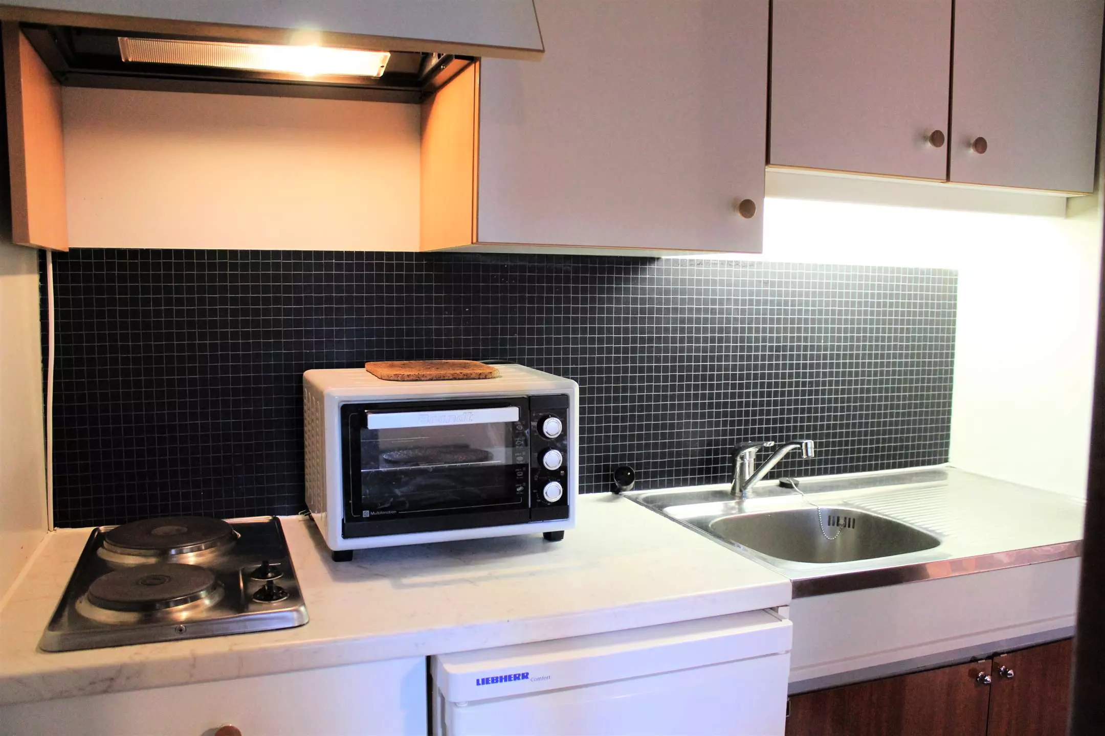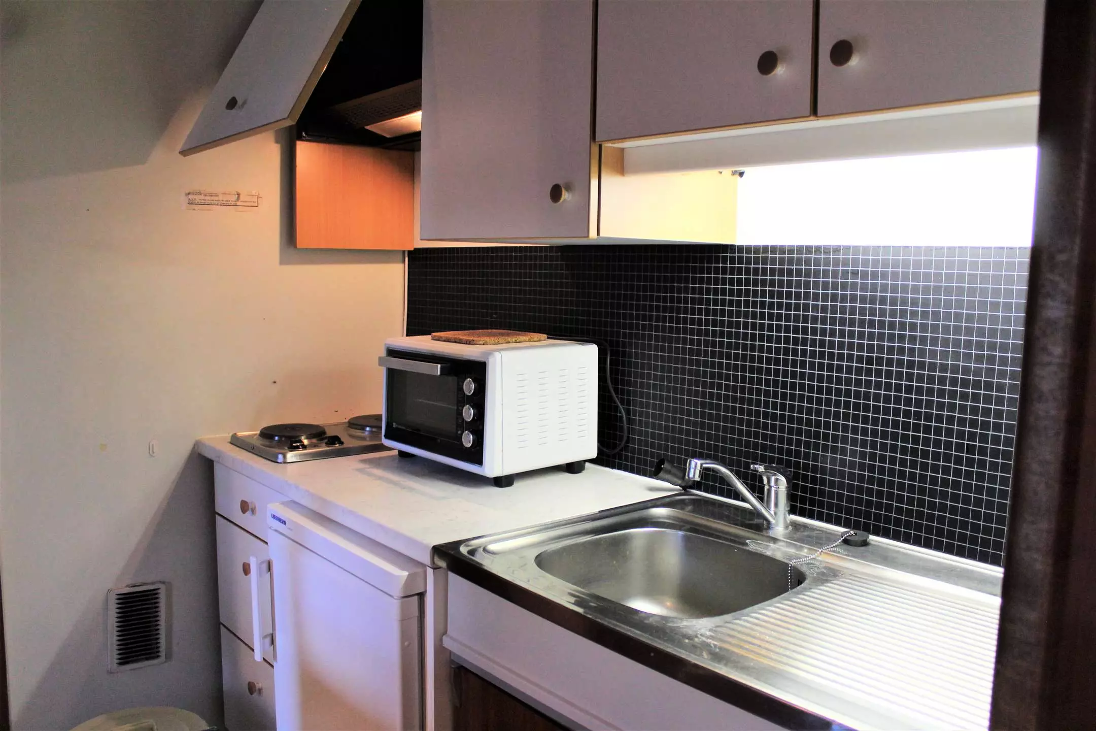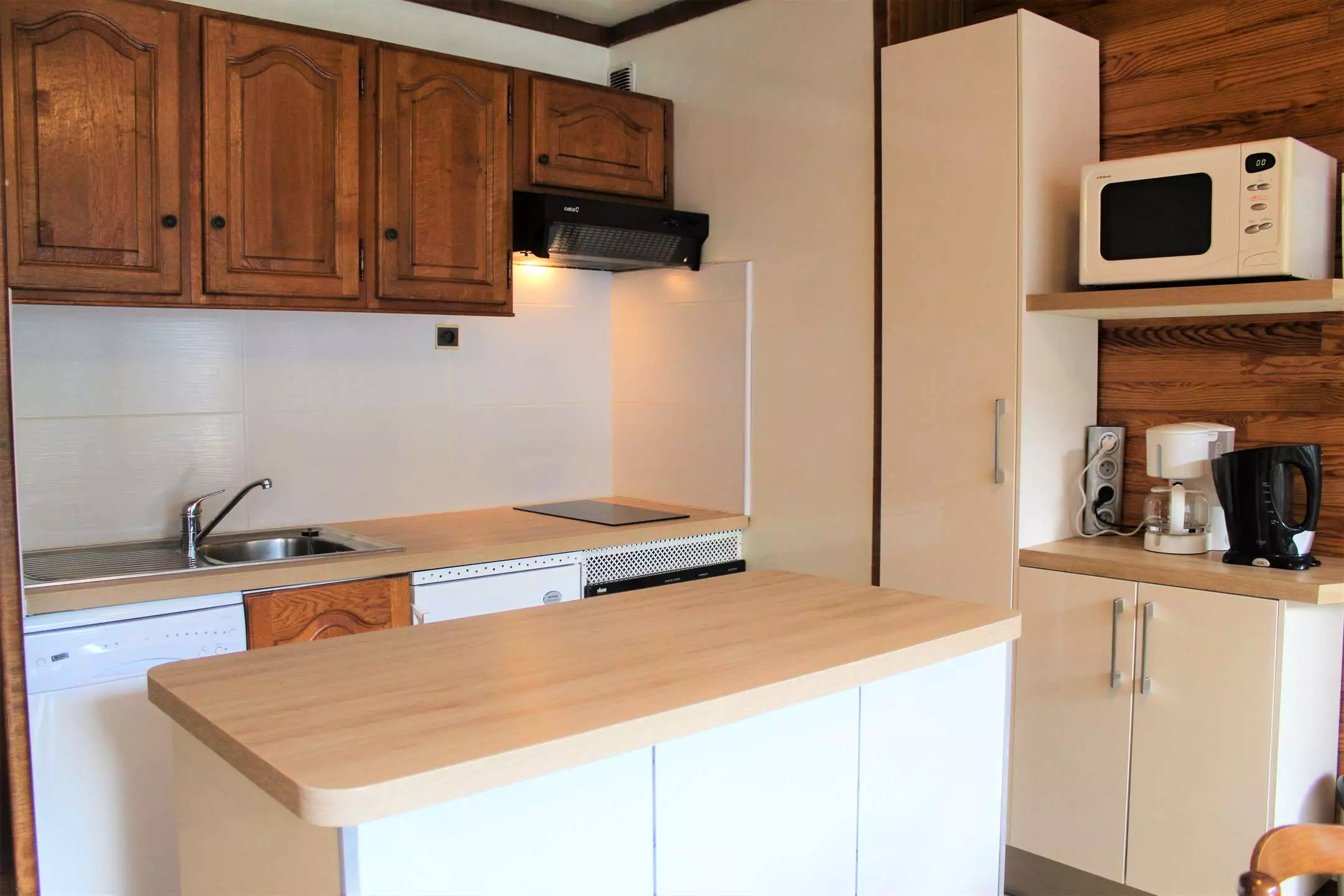 Cette location vacances se compose d'un coin cuisine équipé ouvert sur un séjour disposant d'un canapé convertible rapido pour deux personnes. Vous trouverez dans le coin cabine des lits superposés une place offrant le couchage pour quatre personnes (séparation avec porte accordéon). L'appartement dispose d'une salle d'eau avec une douche et des WC séparés.