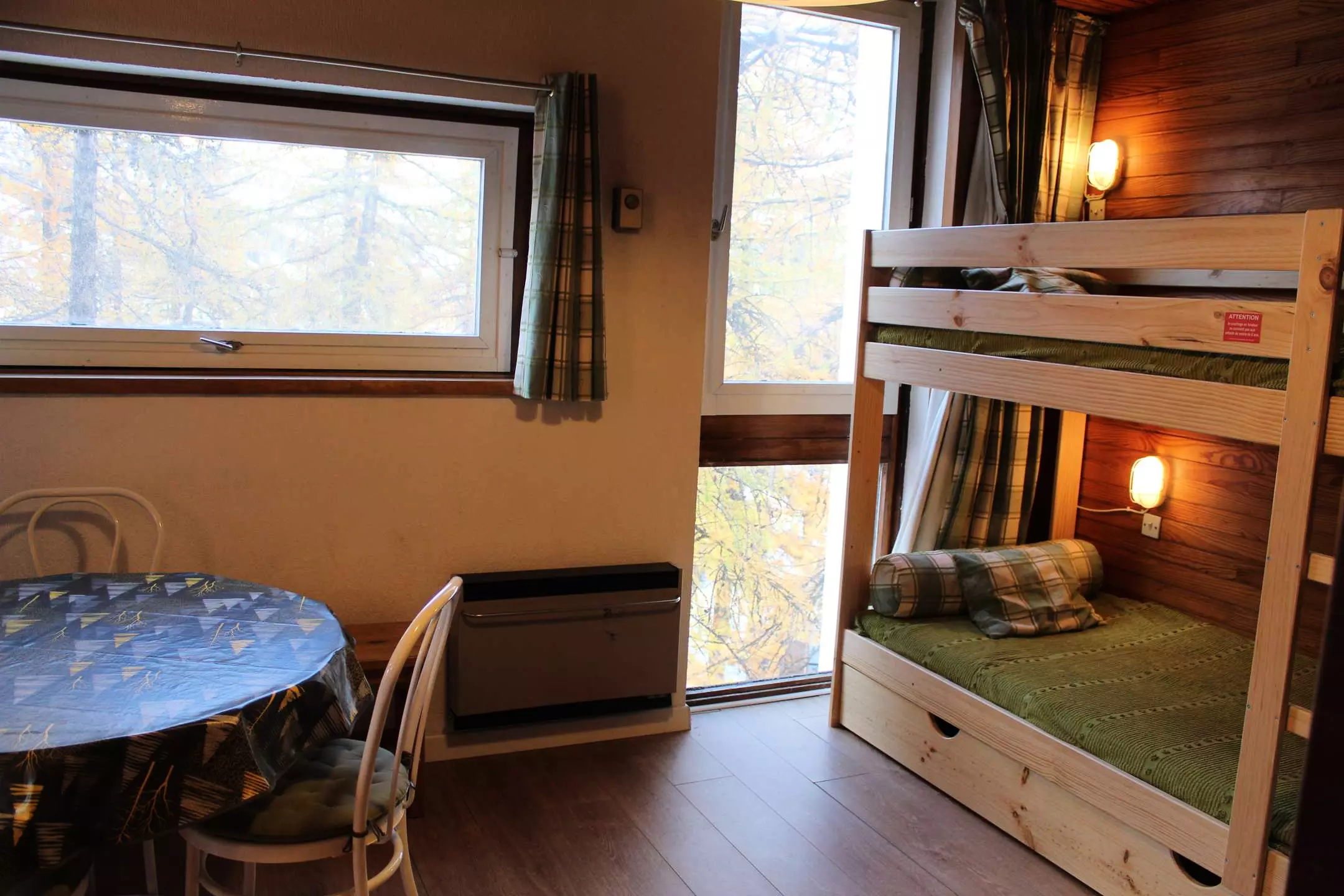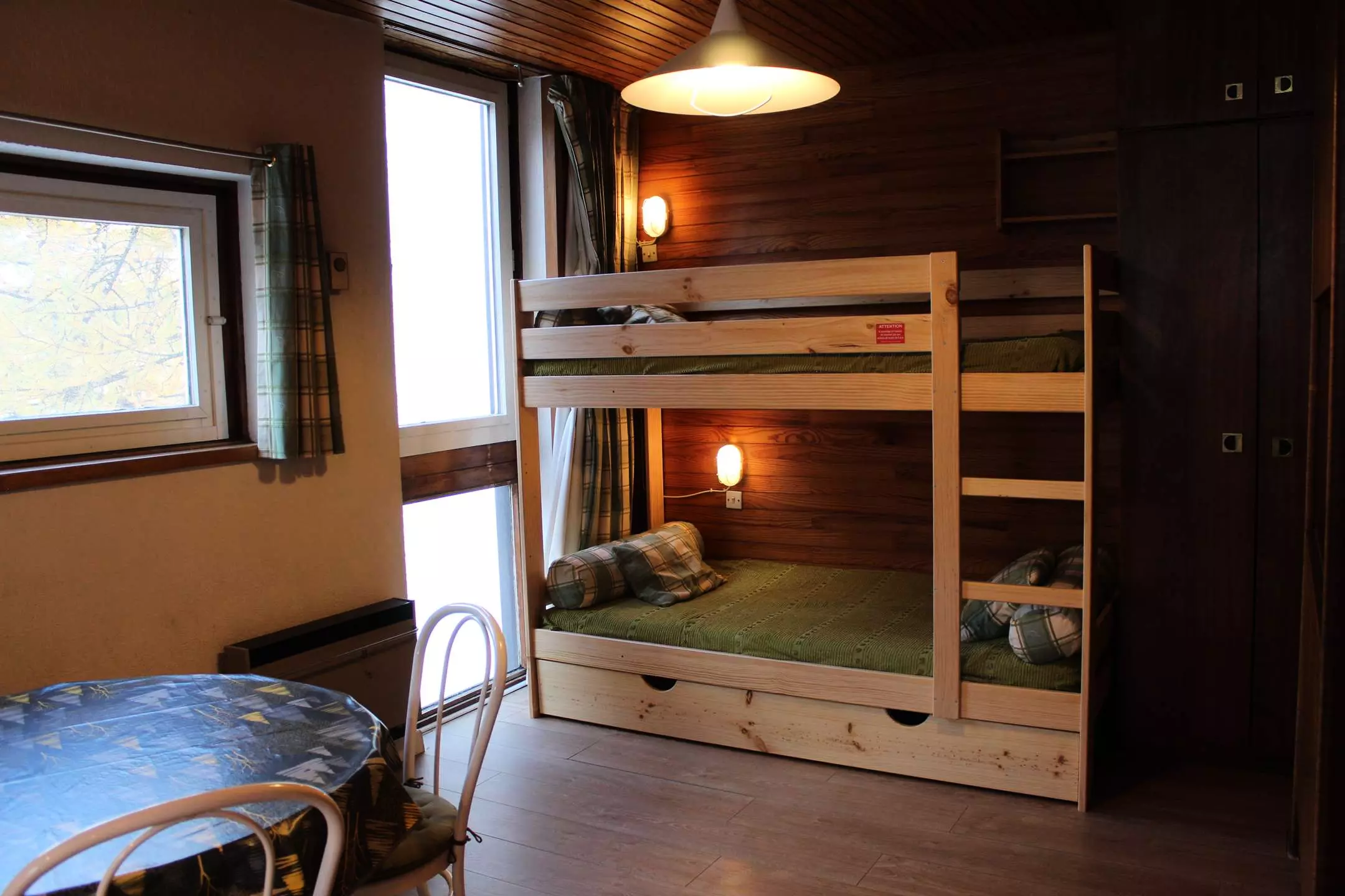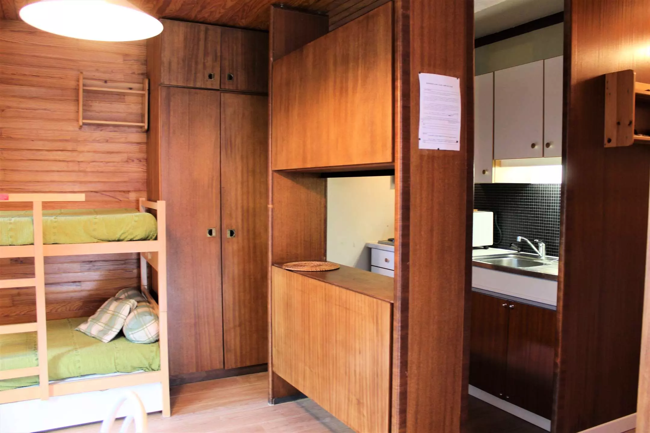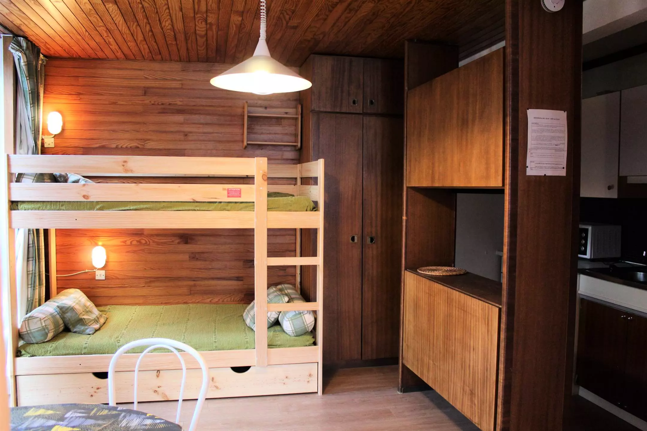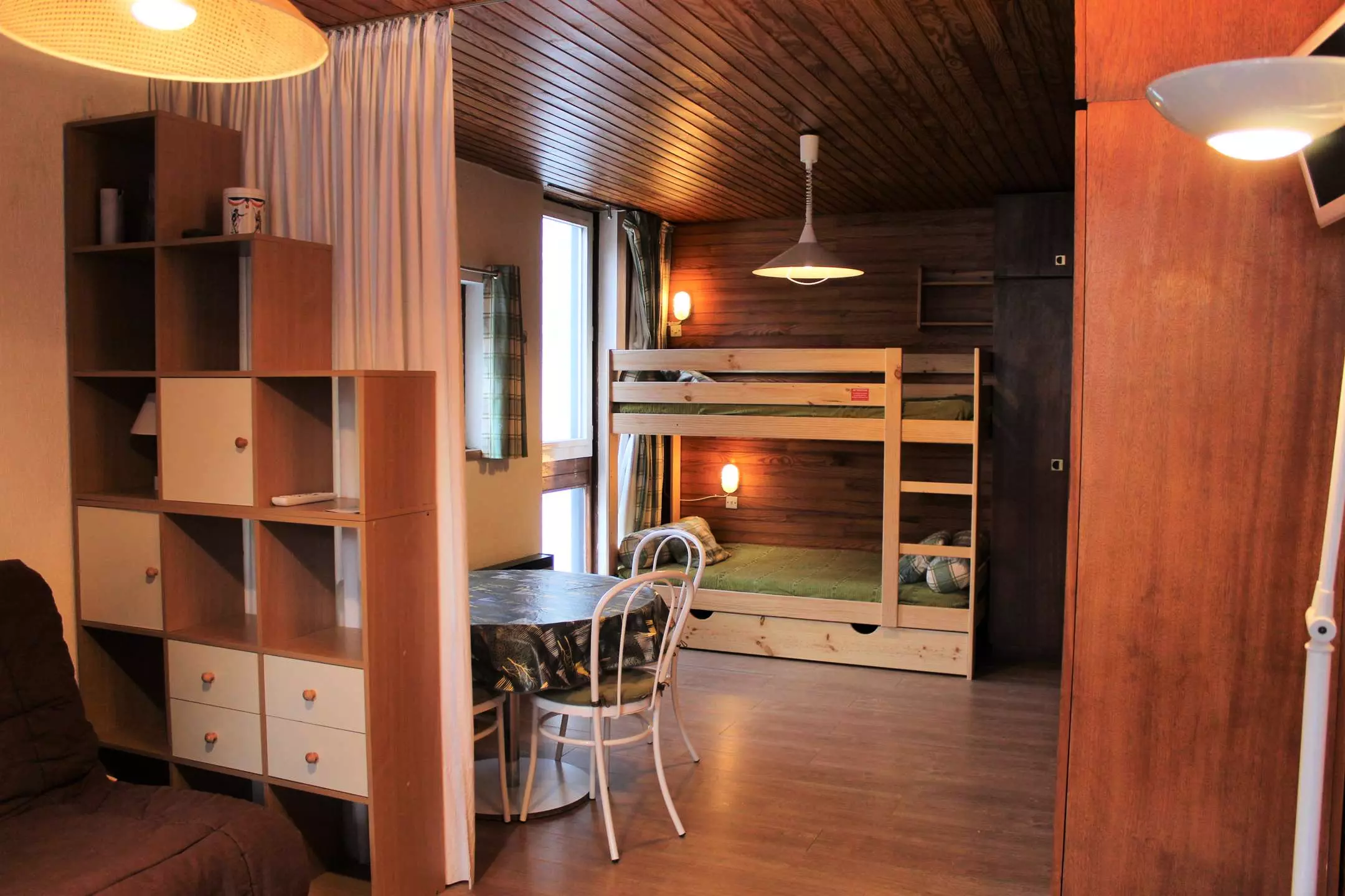 Ce studio à la montagne se compose d'un coin cuisine équipé ouvert sur un séjour disposant d'un canapé convertible pour deux personnes et deux lits superposés (séparation coin nuit avec rideaux). Cet appartement dispose d'une salle d'eau avec une douche et de WC séparés.