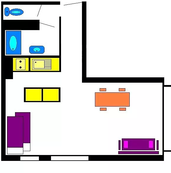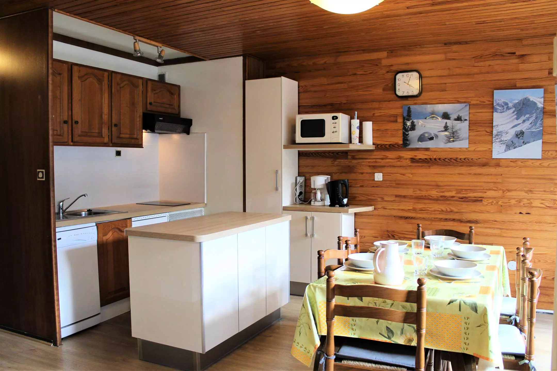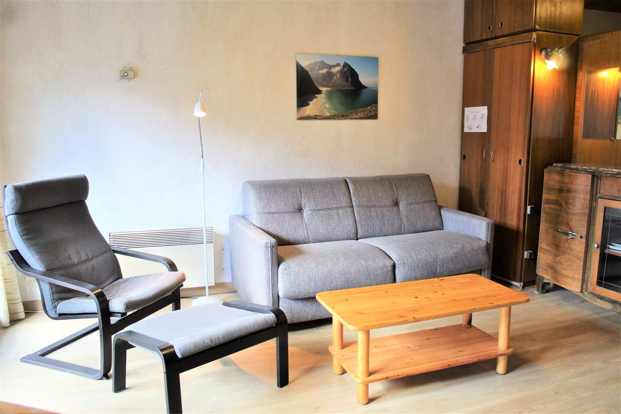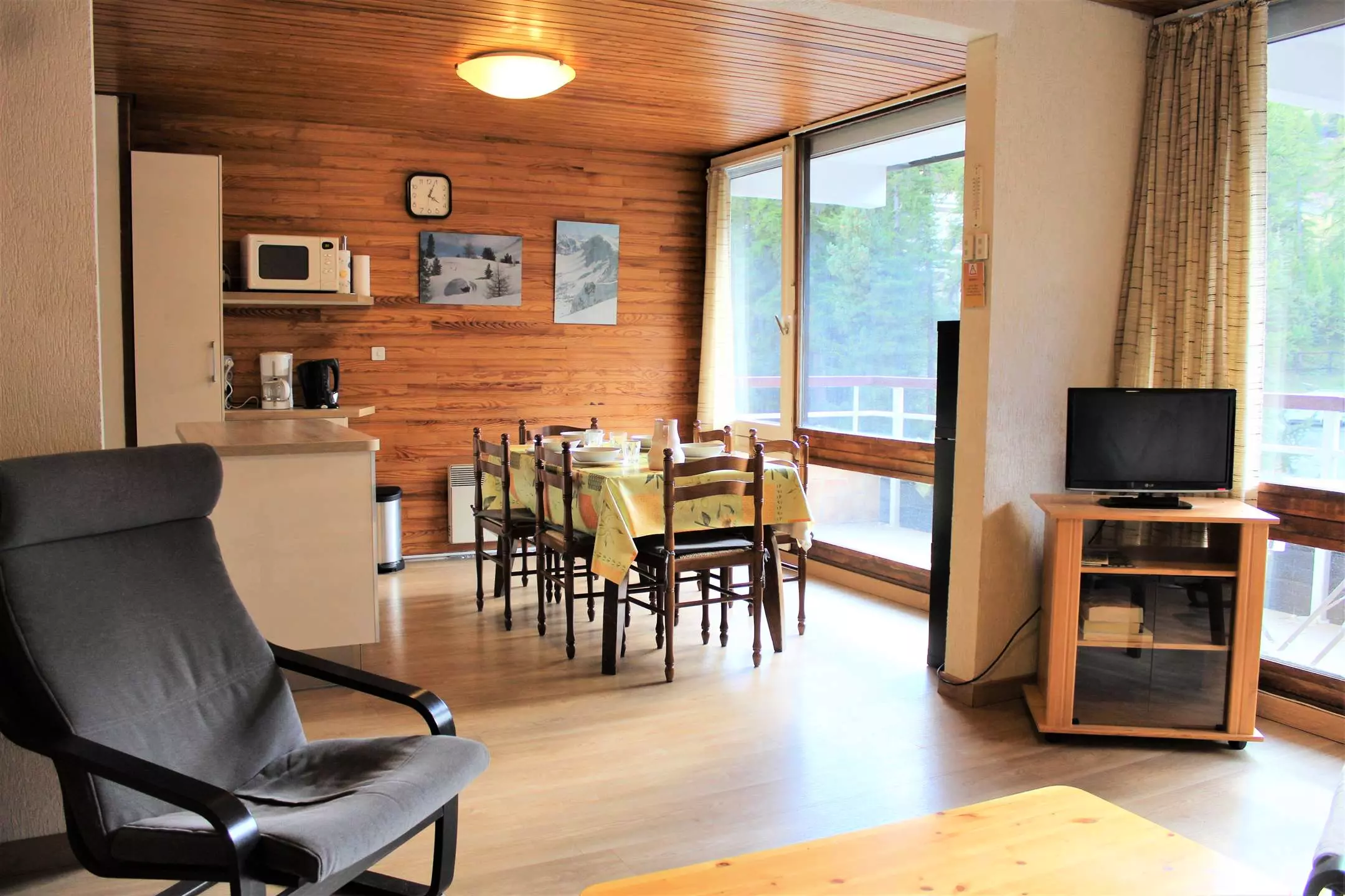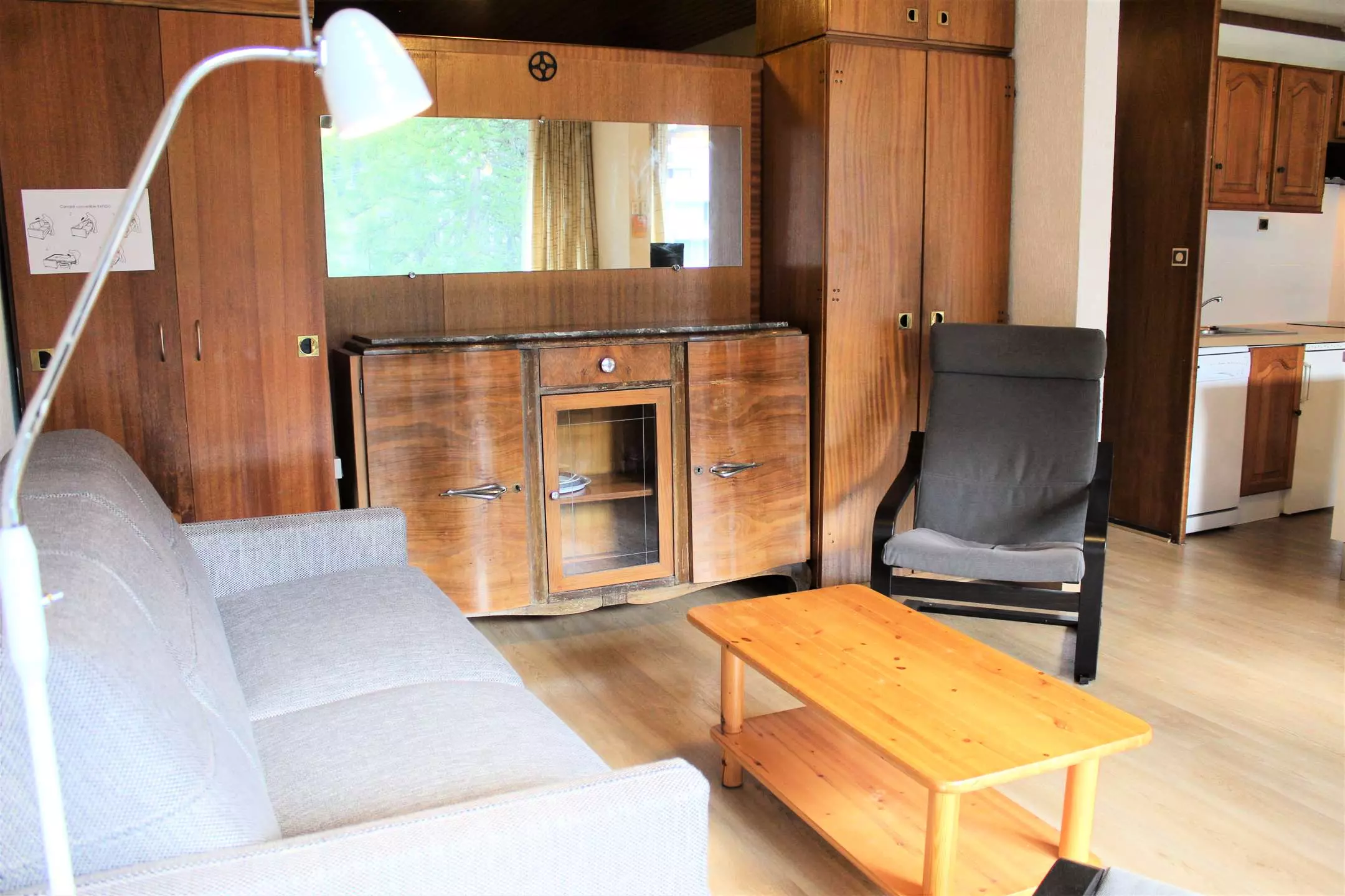 Ce studio à la montagne se compose d'un coin cuisine équipé ouvert sur un séjour disposant d'un canapé convertible pour deux personnes et deux lits superposés (séparation coin nuit avec rideaux). Cet appartement dispose d'une salle d'eau avec une douche et de WC séparés.