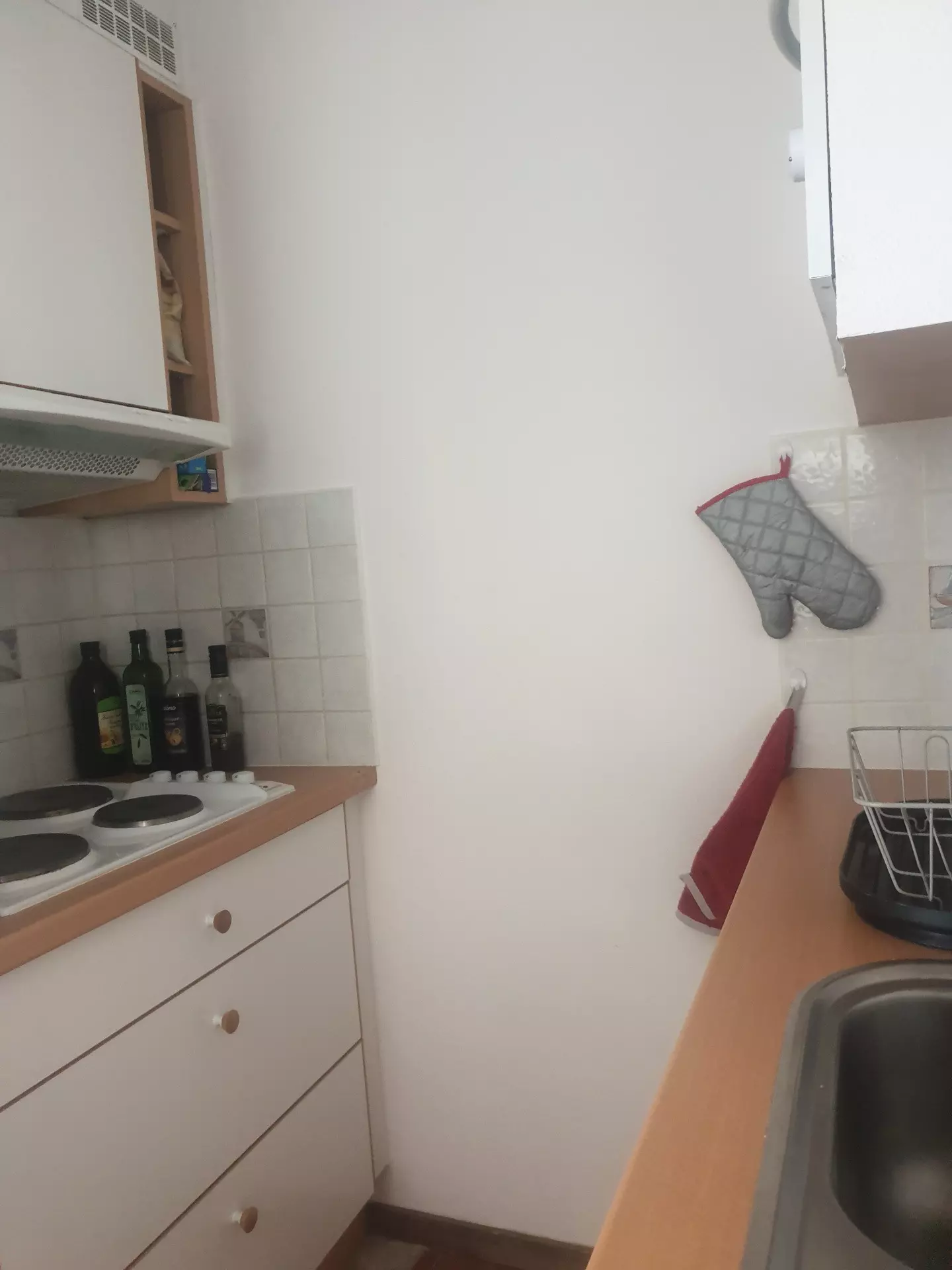Cuisine: four, micro ondes, plaques de cuisson vitrocéramiques 2 feux, réfrigérateur et lave-vaisselle.