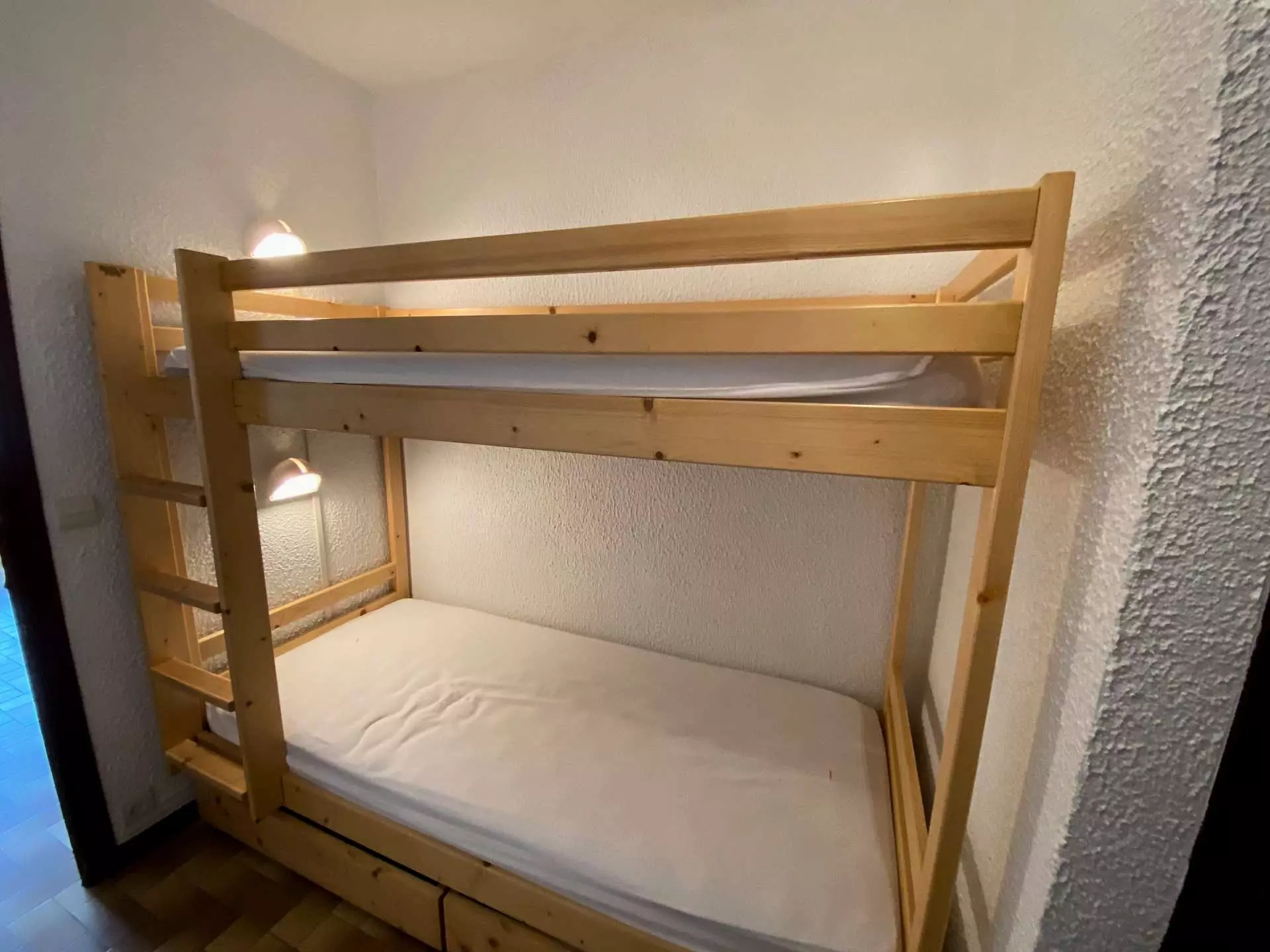 Cet appartement de vacances situé au 1er étage, comprend un séjour avec 1 lit meuble escamotable 2 personnes et télévision + lecteur DVD, accès balcon Sud avec vue sur le village, un coin cuisine équipé, 2 lits superposés 1 personne, une salle de bains avec WC .