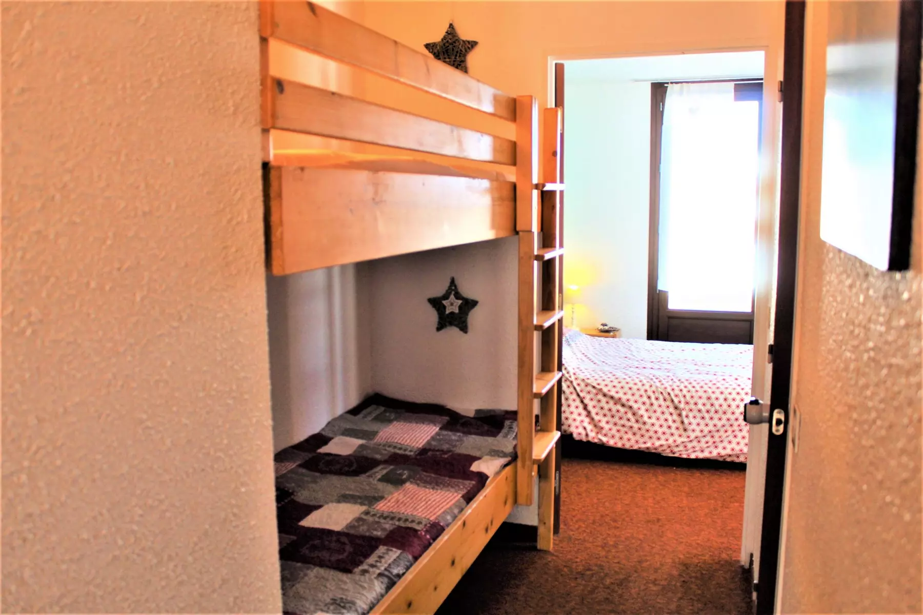 Situé dans une résidence en pied de pistes, cet appartement se compose d'une grande chambre avec un lit en 140 et un lit simple, d'un coin montagne avec deux lits superposés, et d'un séjour avec clic-clac ouvrant sur une terrasse en exposition sud avec un accès direct sur les pistes. Il possède aussi une cuisine bien équipée, une salle de bain avec baignoire et des WC indépendants. L'appartement dispose aussi d'un casier à ski.