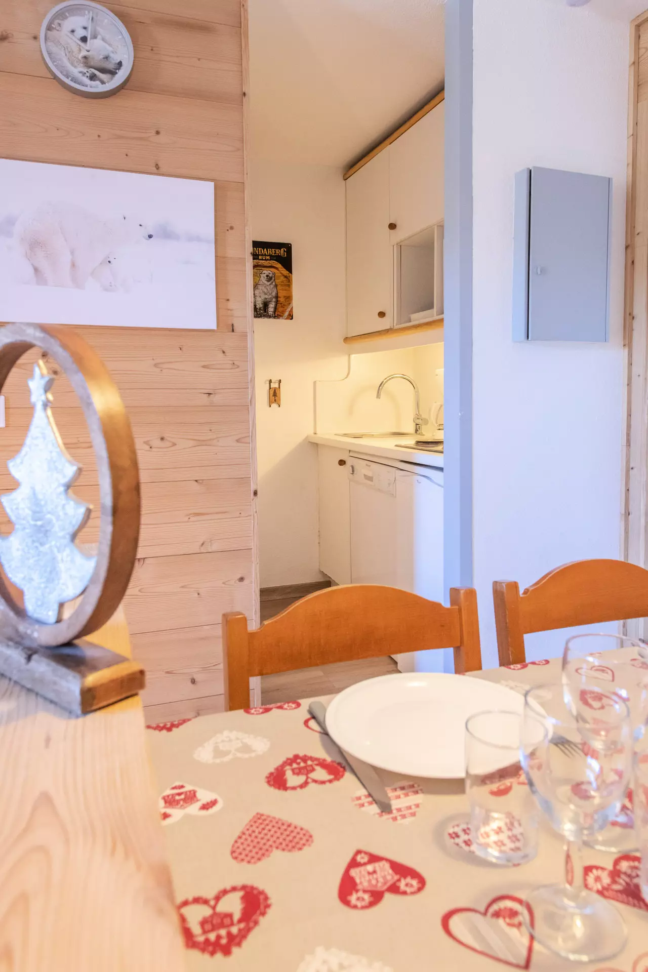 - Séjour avec canapé convertible, cuisine ouverte et espace repas