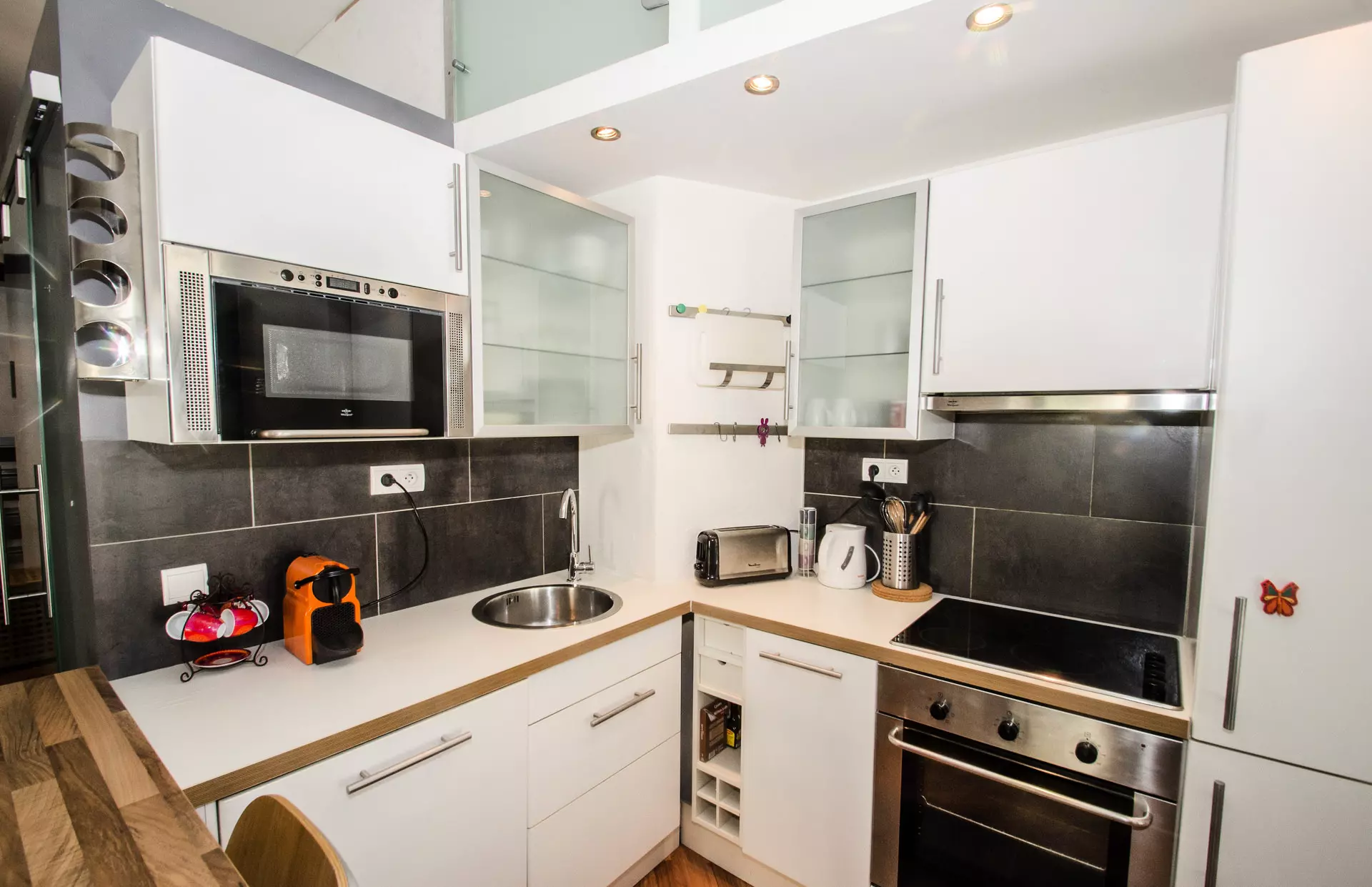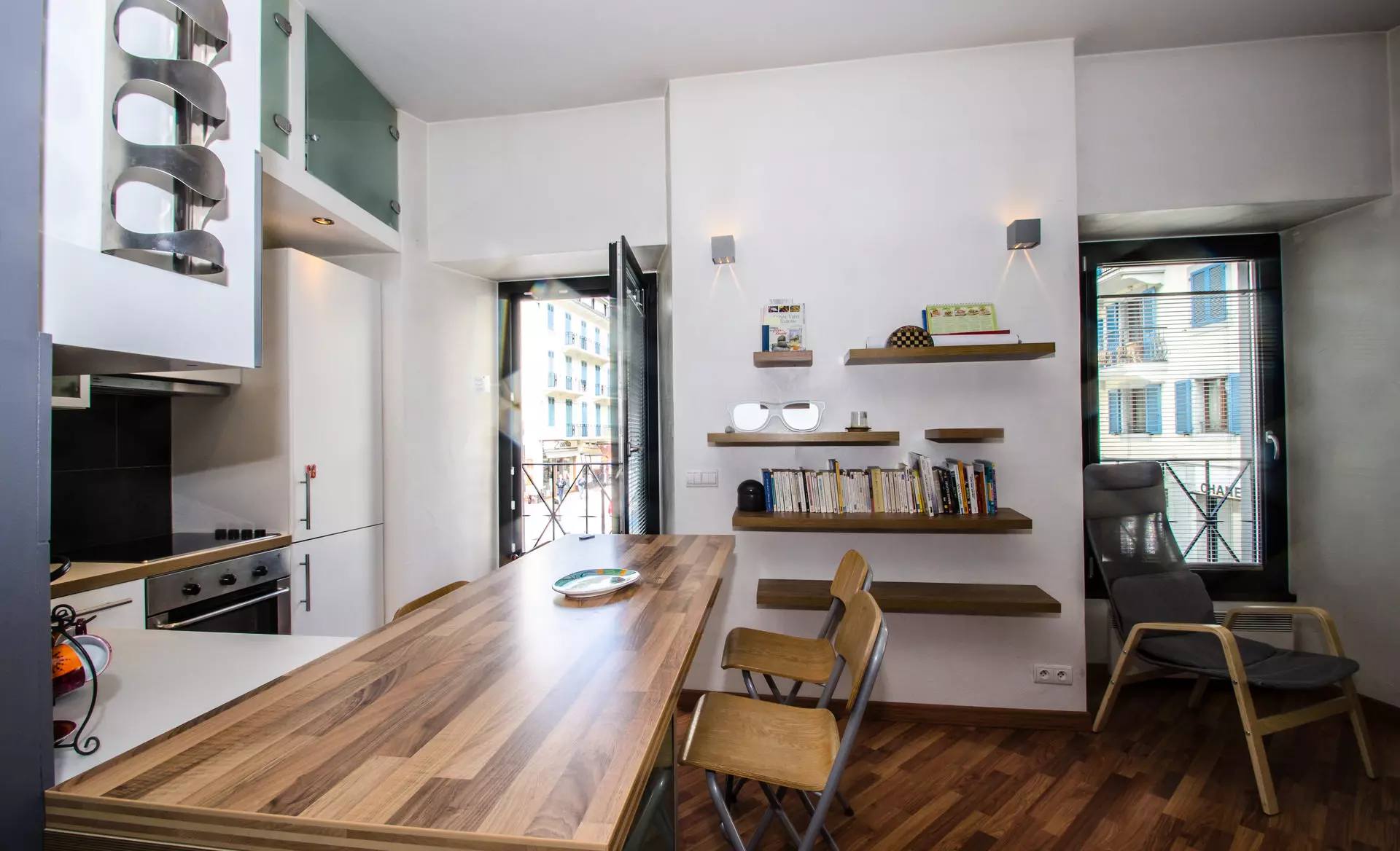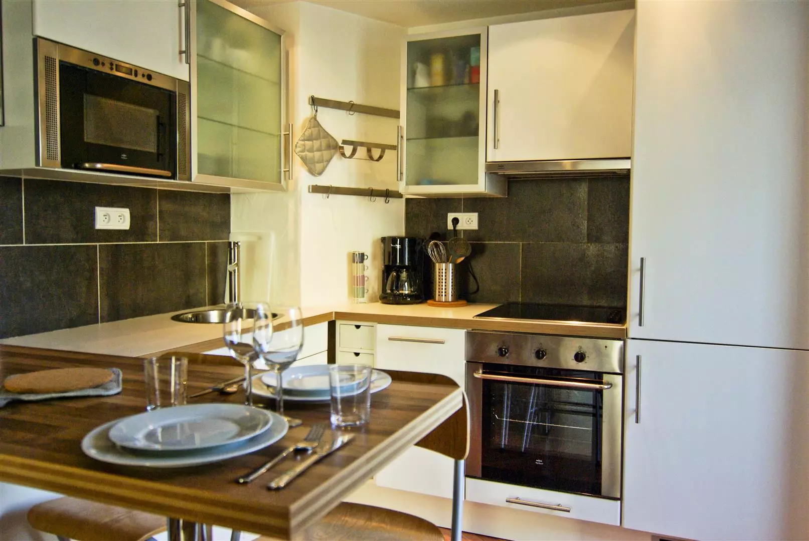 - Cuisine équipée ouverte avec une table bar pour 4 personnes (four, vitrocéramiques, réfrigérateur, congélateur, lave-vaisselle, cafetière filtre, bouilloire, grille-pain)