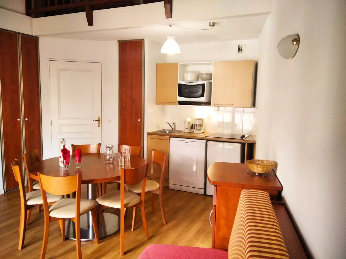 - Coin cuisine avec 4 plaques vitrocéramiques, réfrigérateur, micro-ondes/grill, lave- vaisselle, bouilloire et cafetière électrique