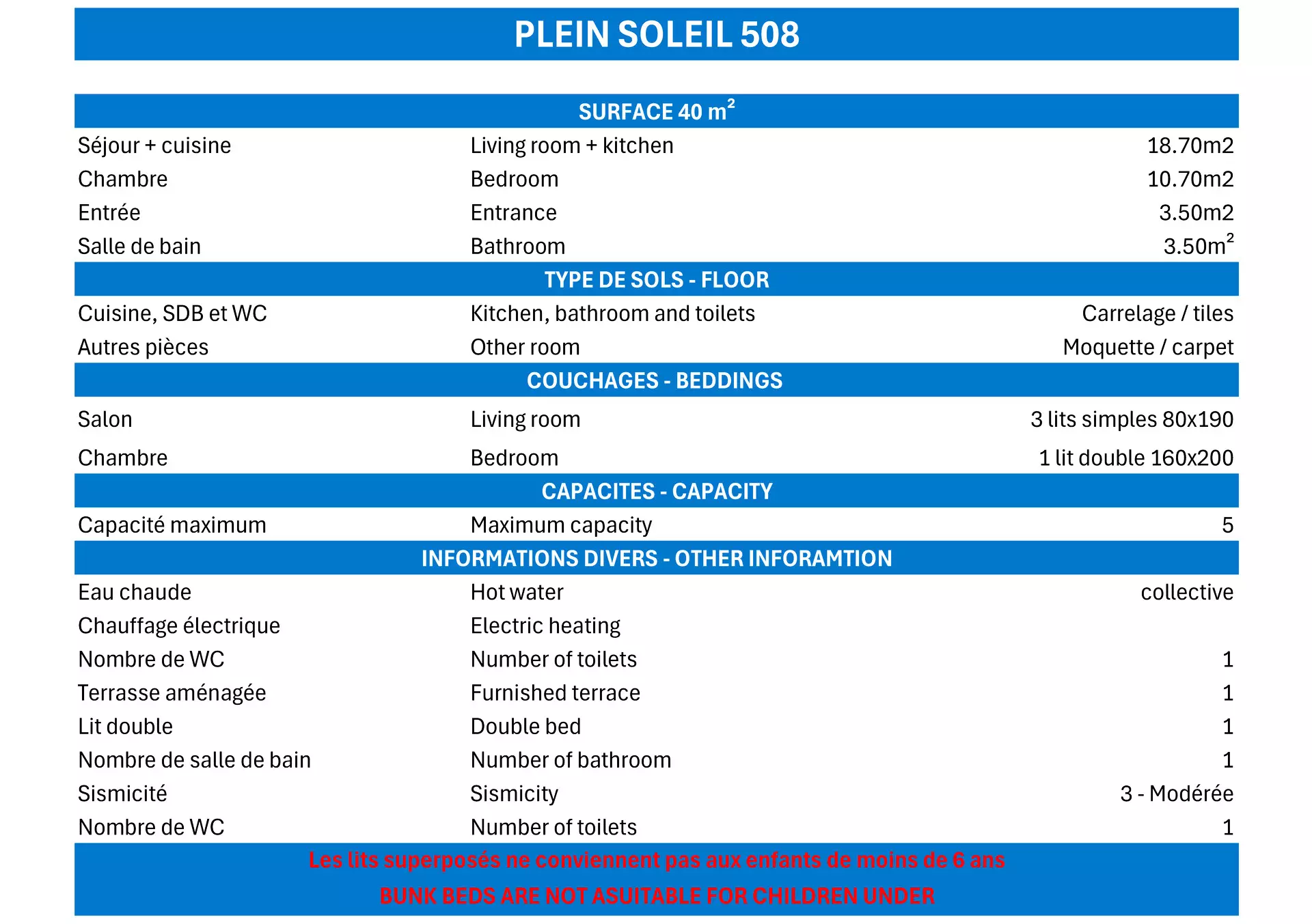Séjour : 1 banquette lit 1 personne (80x190cm) et 1 ensemble de lits gigognes (80x190cm)
