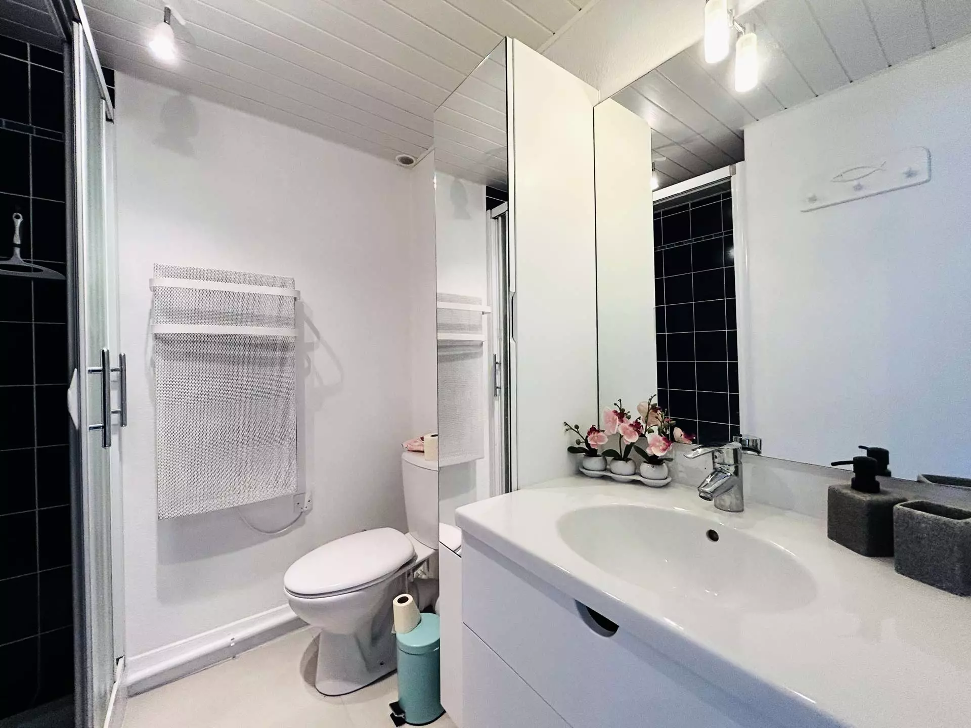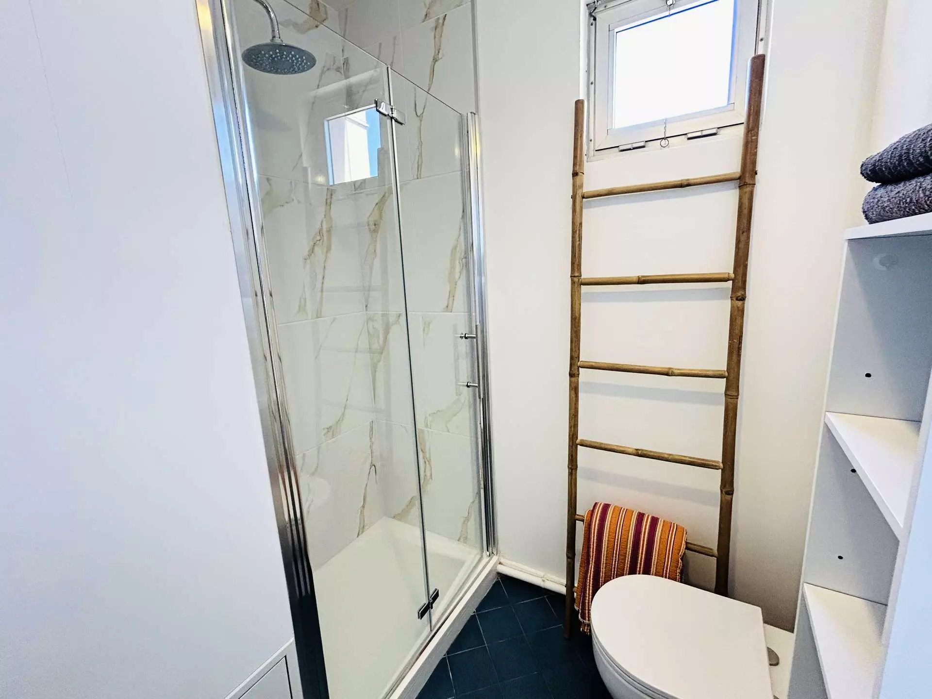 Cet appartement de vacances situé au 1er étage sans ascenseur comprend un séjour avec 1 canapé convertible et une télévision écran plat, un coin cuisine équipé et une salle de douche avec WC.