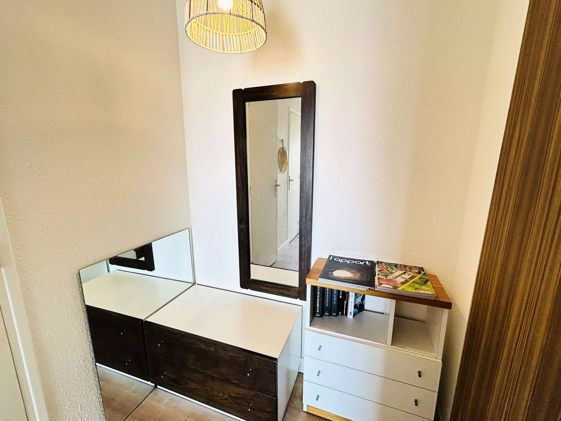 Cet appartement de vacances situé au 2ème étage sans ascenseur comprend un séjour avec 2 canapés et une télévision écran plat, une petite chambre avec un lit double au sol, un coin cuisine équipé et une salle de douche avec WC.