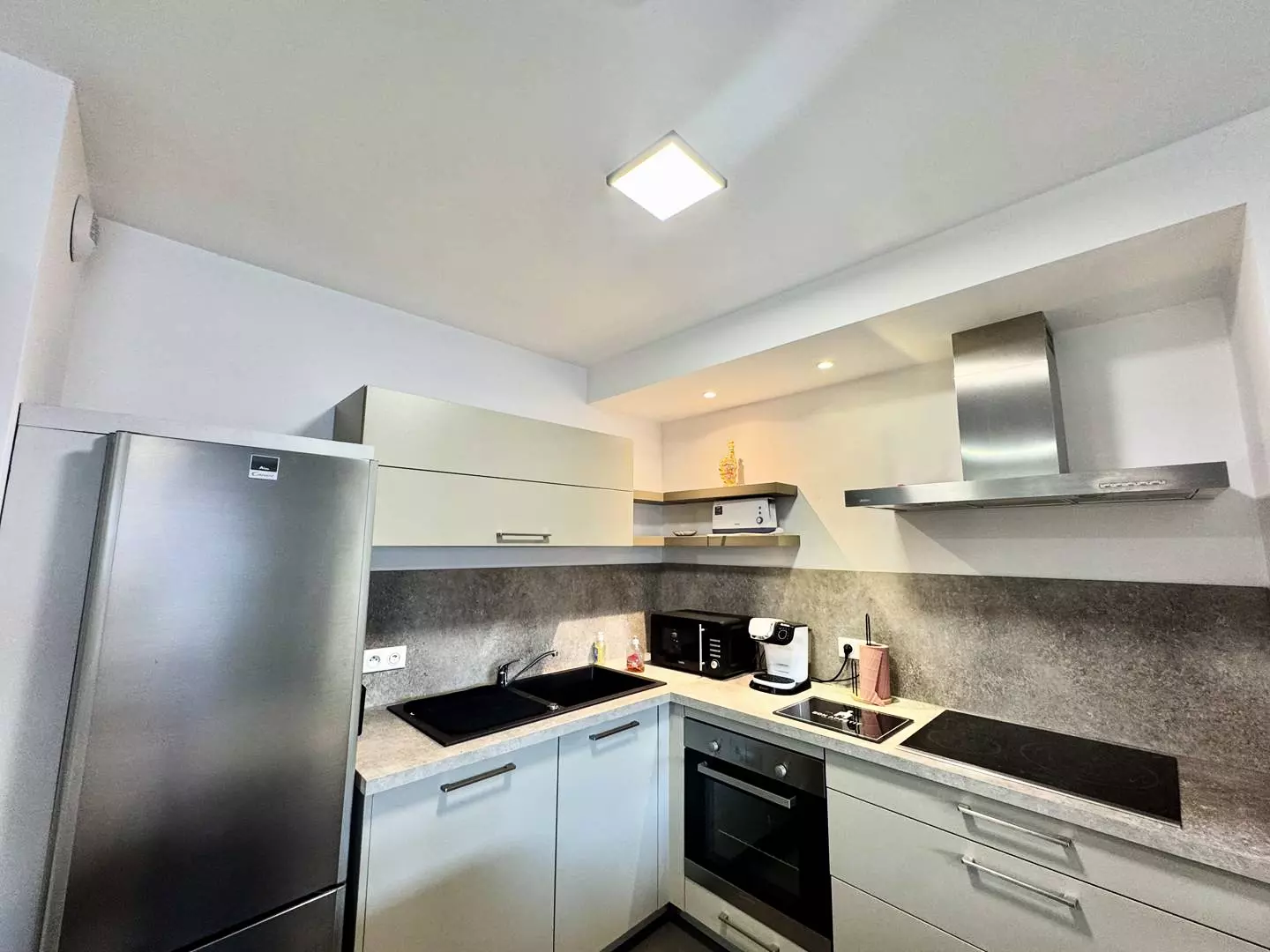 Un pièce à vivre avec coin salon (canapé convertible) et cuisine ouverte,