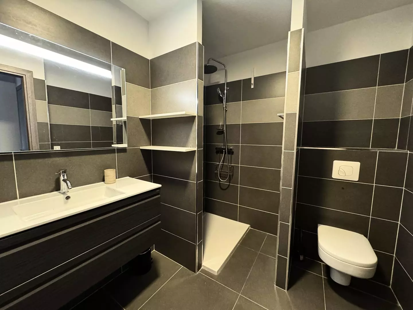 Un belle salle d'eau avec douche et WC,