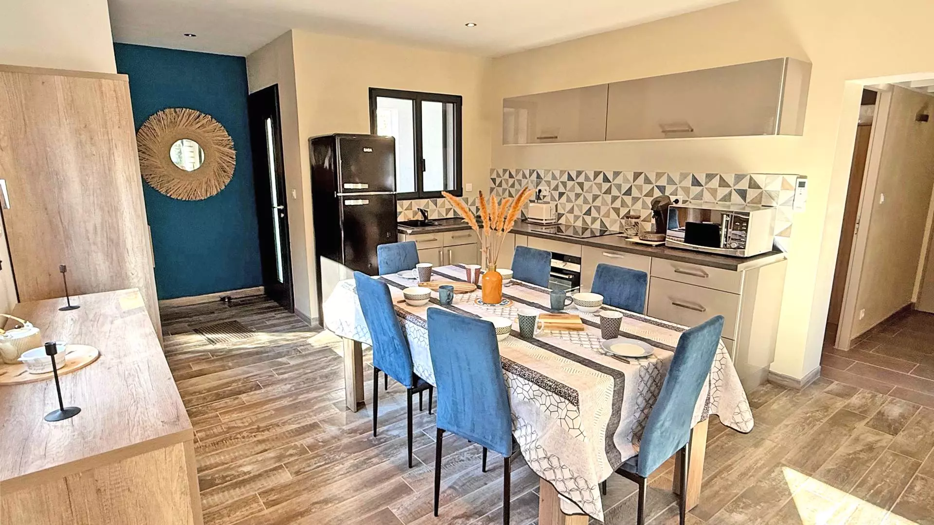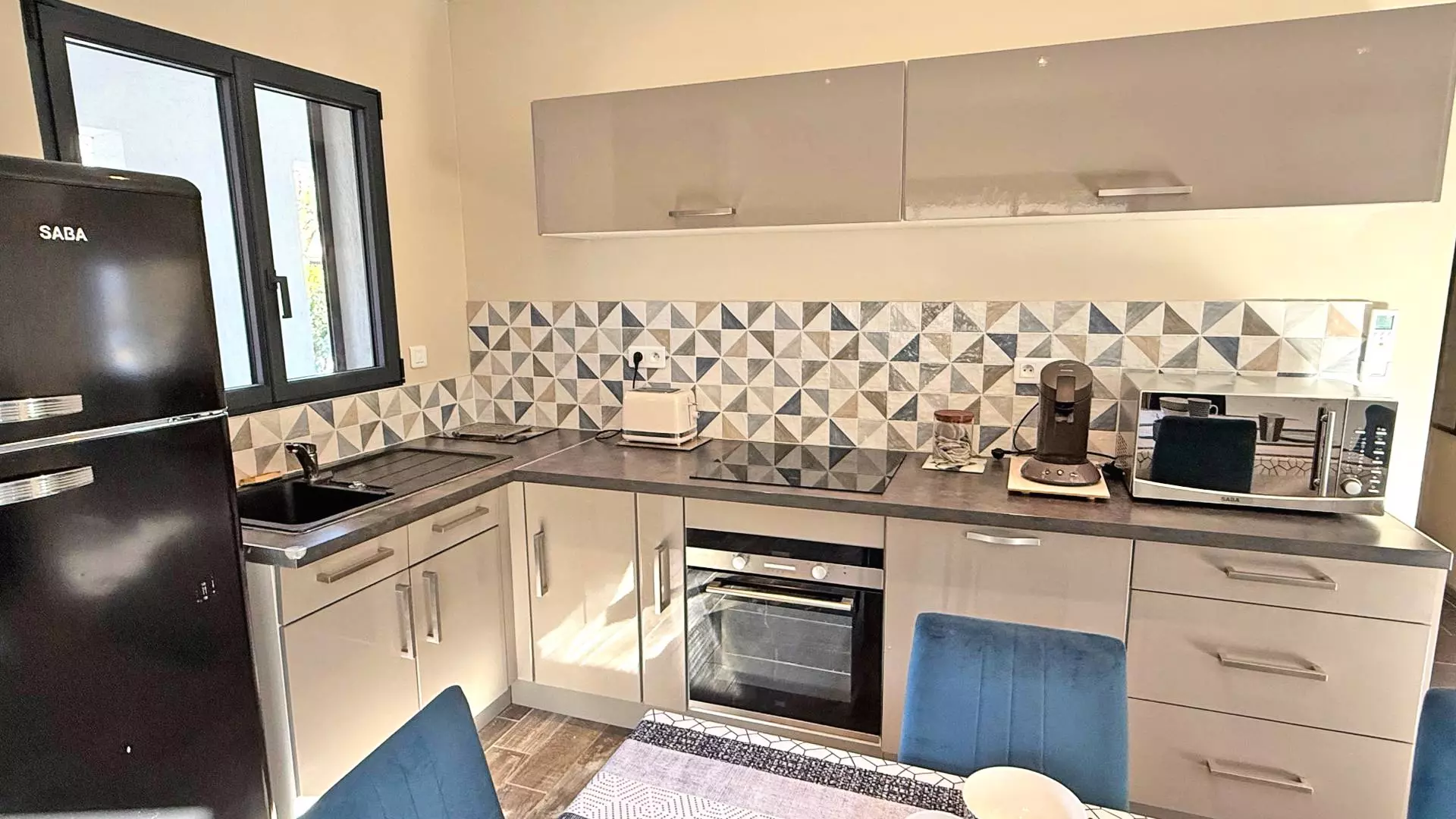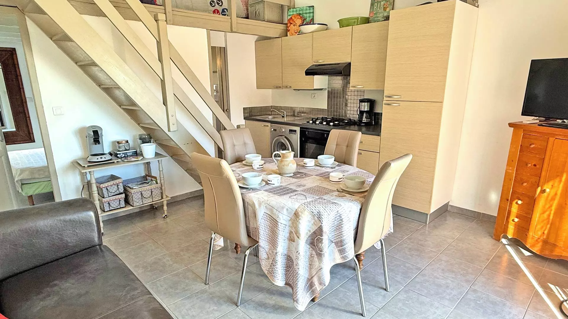 - Cuisine équipée ouverte avec four, micro-ondes, plaque de cuisson vitrocéramique, lave-vaisselle, réfrigérateur avec compartiment congélation, cafetière Senseo, grille pain et ustensiles divers