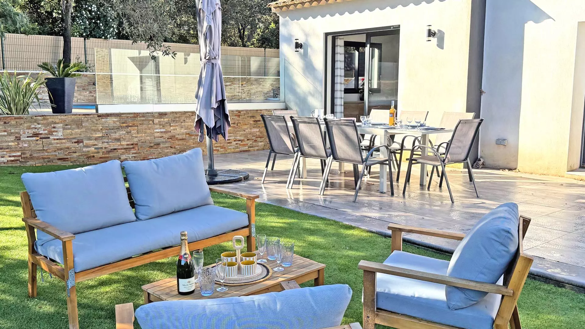 - Terrasse avec coin repas pour 8 personnes, jardin privatif avec mobilier de jardin, barbecue au gaz, parasols