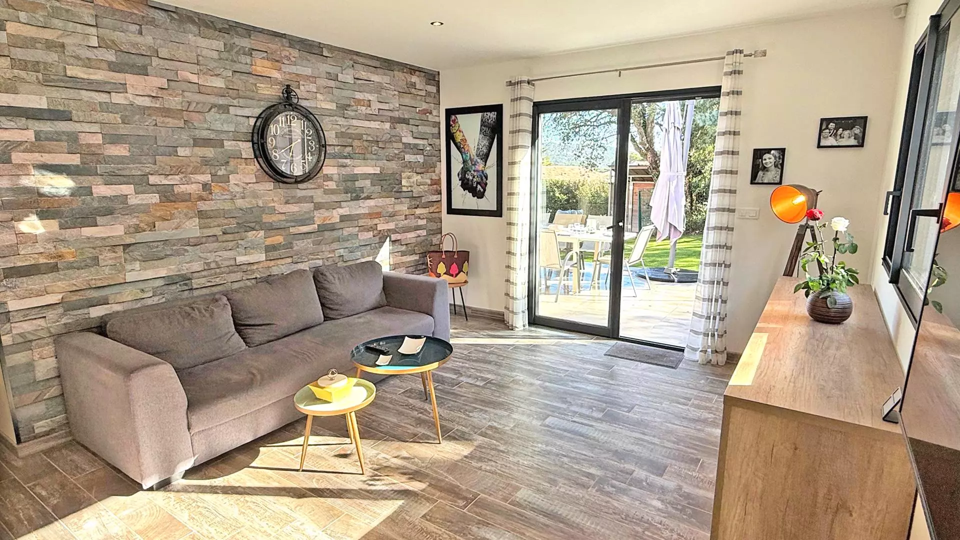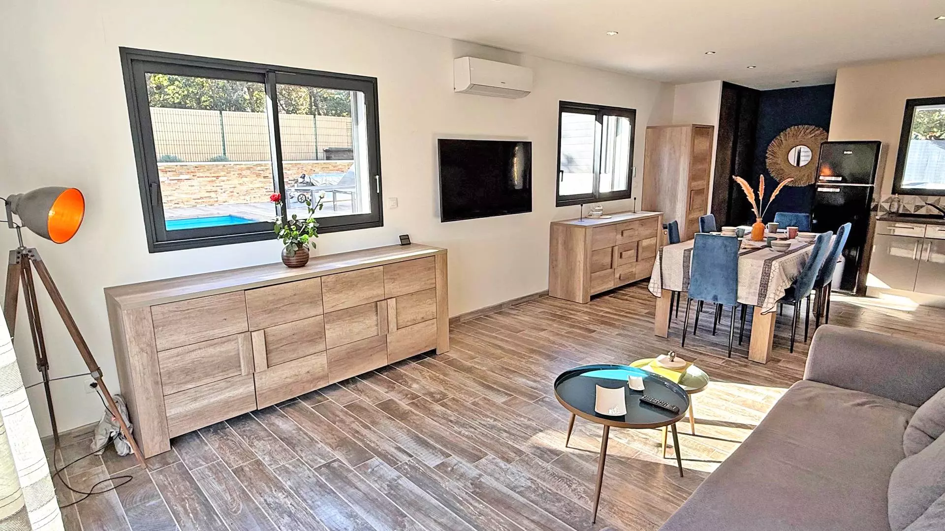 - Pièce à vivre climatisée répartie en 2 espaces : table à manger et salon avec canapé et télévision, accès terrasse et piscine