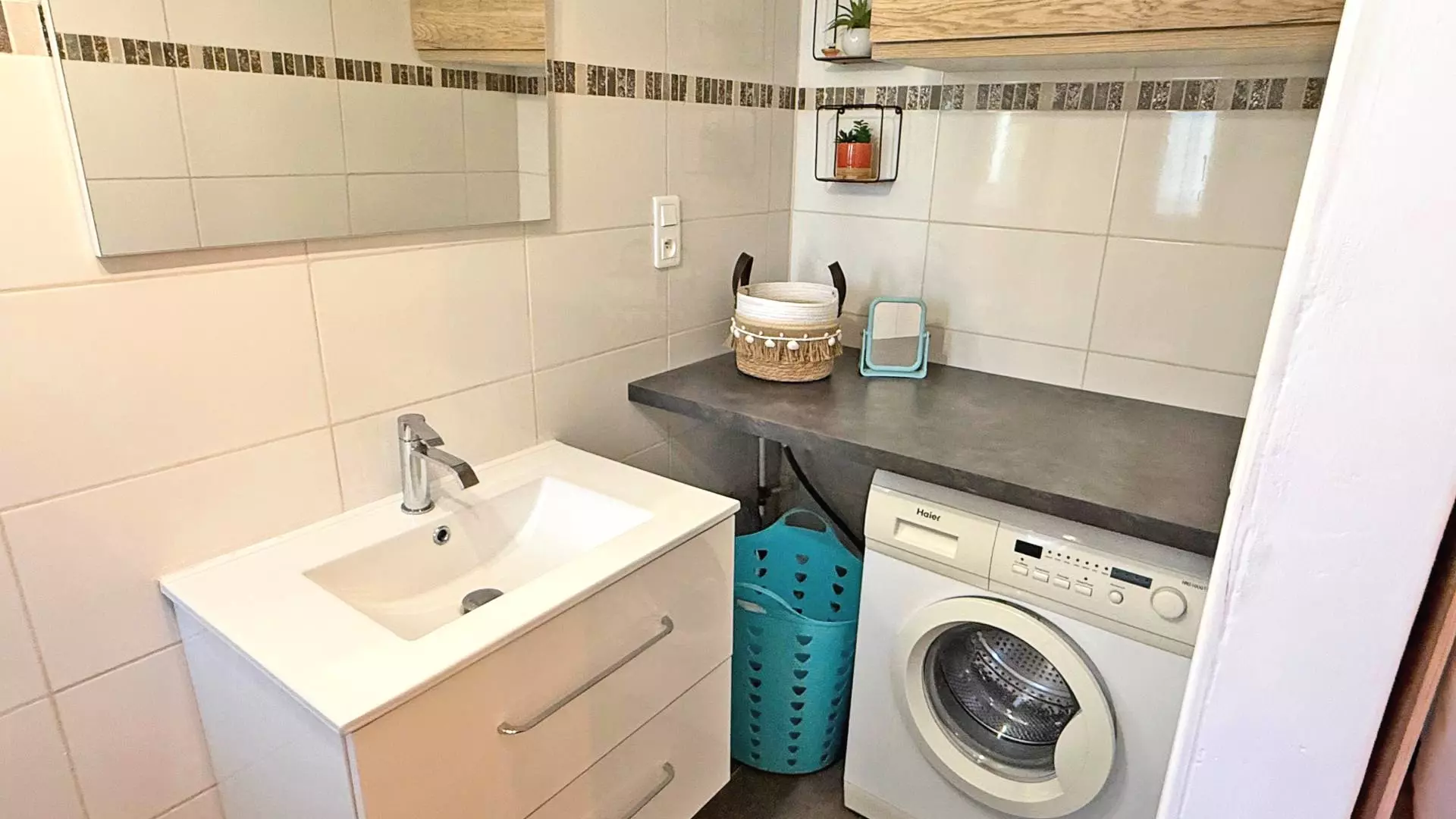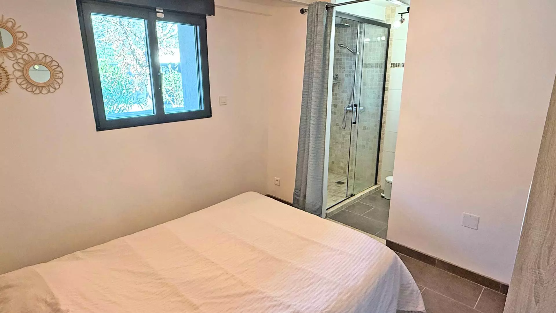 - Chambre 1 climatisée : Lit double 140cm, placard et salle d'eau avec douche, meuble vasque et lave linge