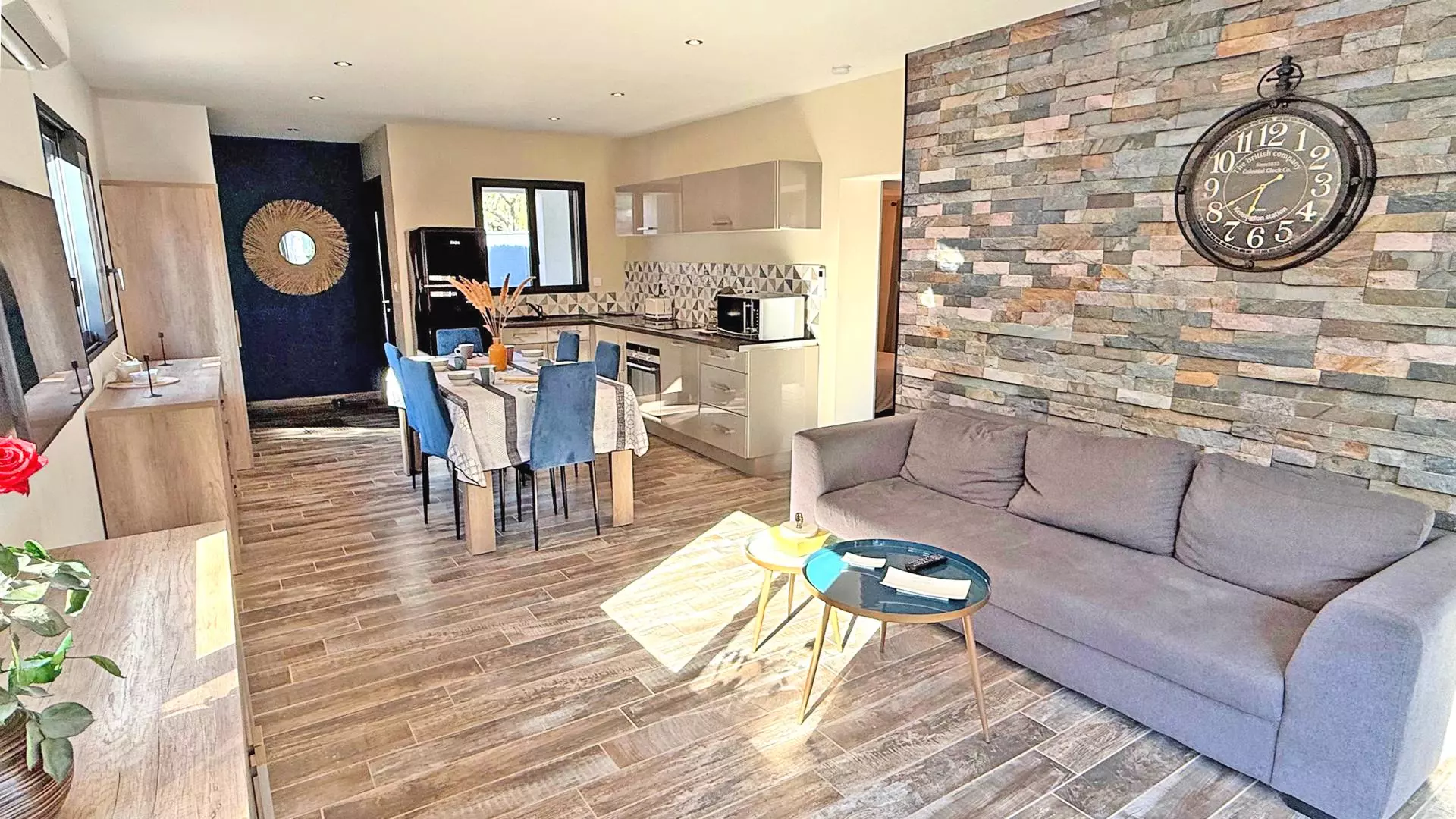 - Pièce à vivre climatisée avec table à manger, canapé, télévision avec accès terrasse
