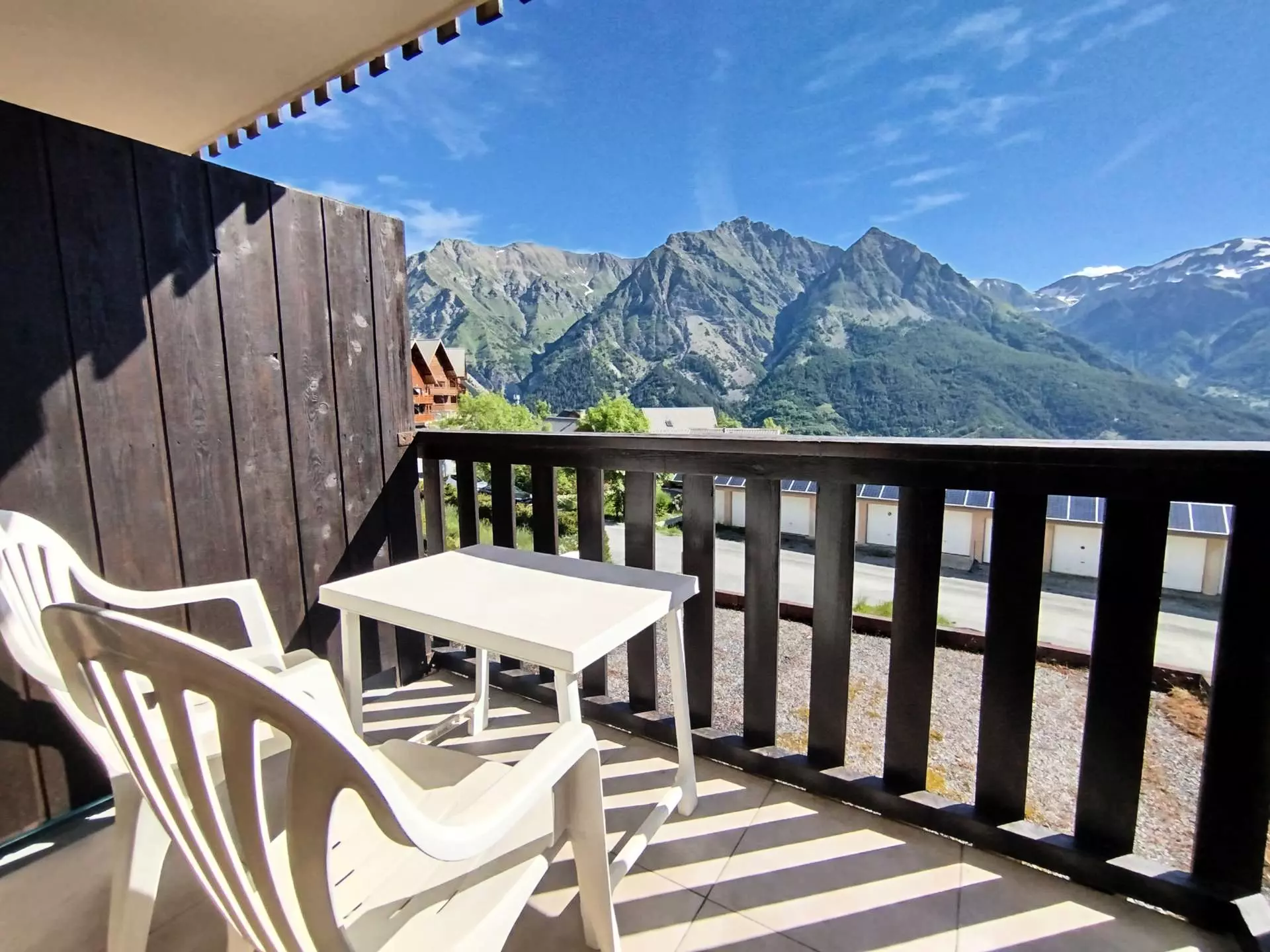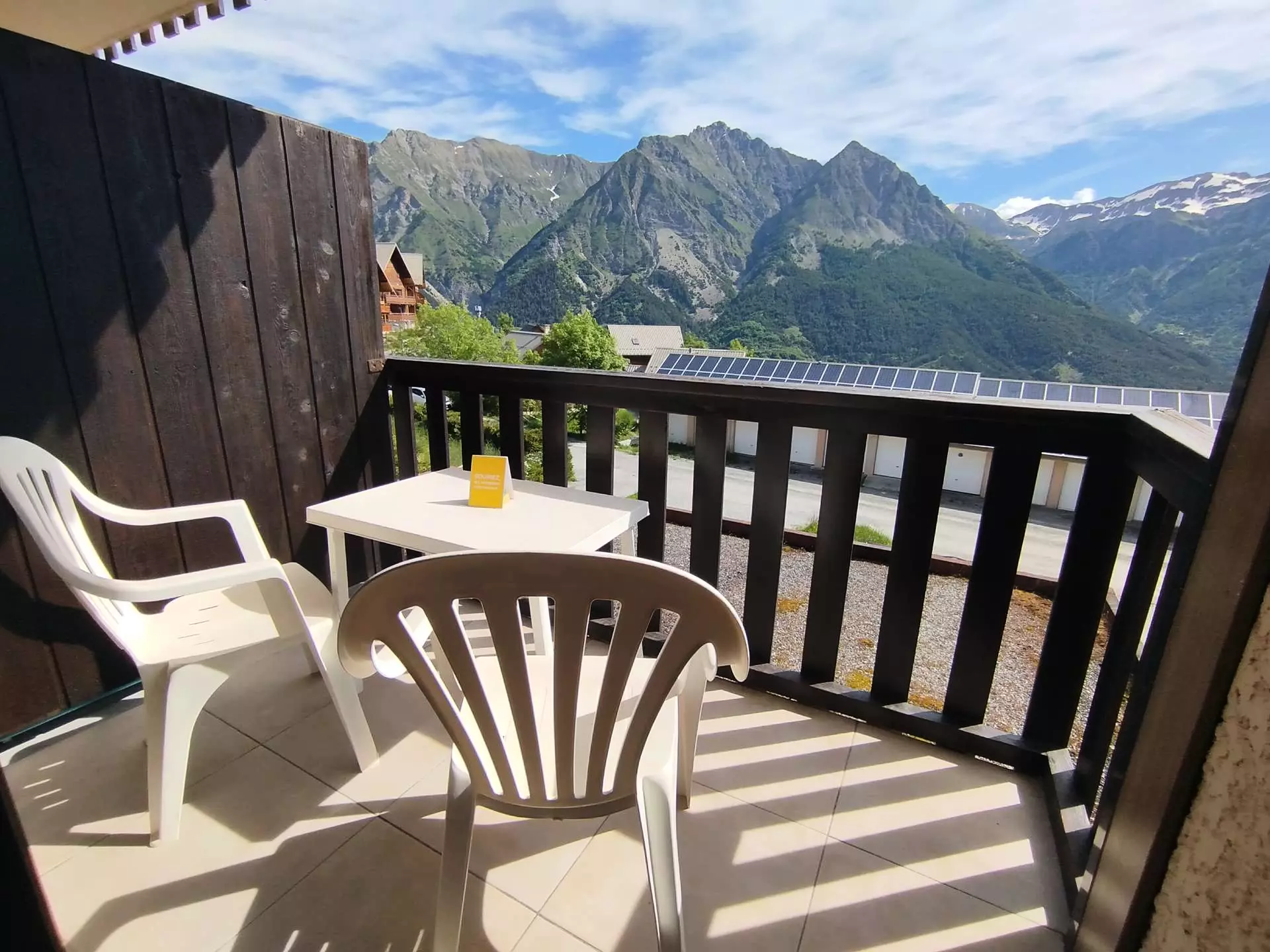 - Balcon avec table et chaises, vue sur les Aiguilles de Chabrières