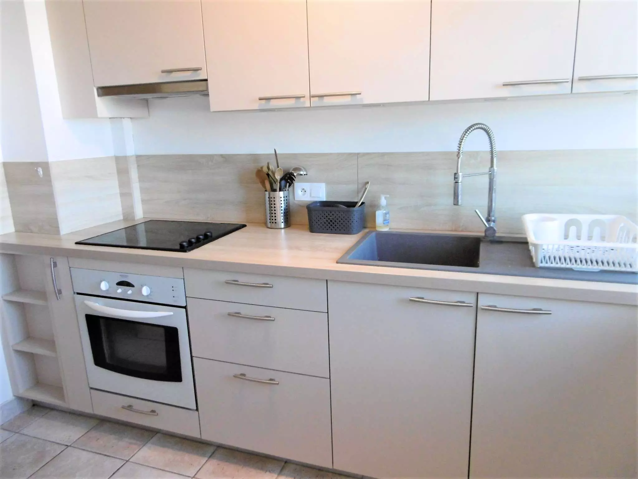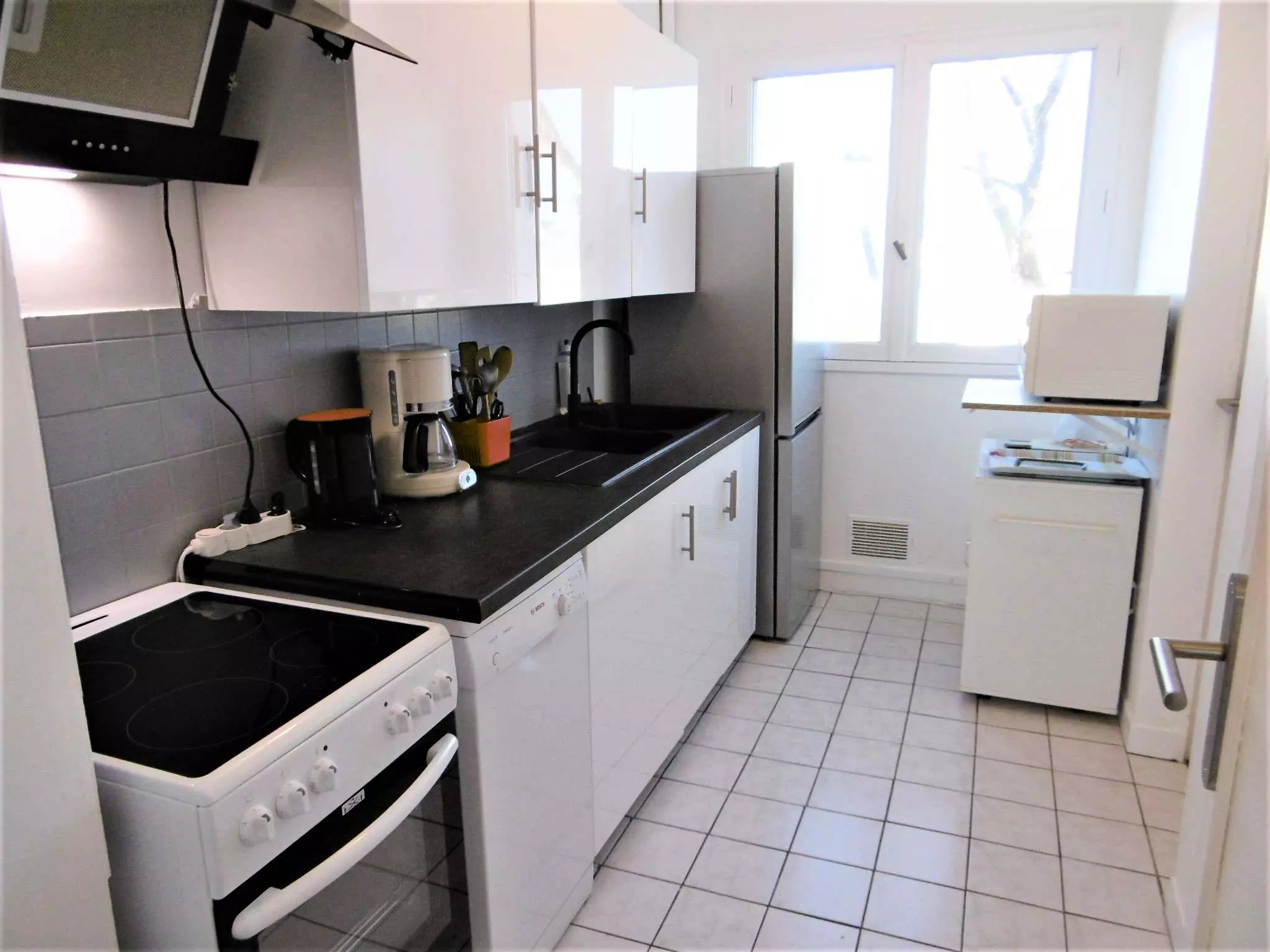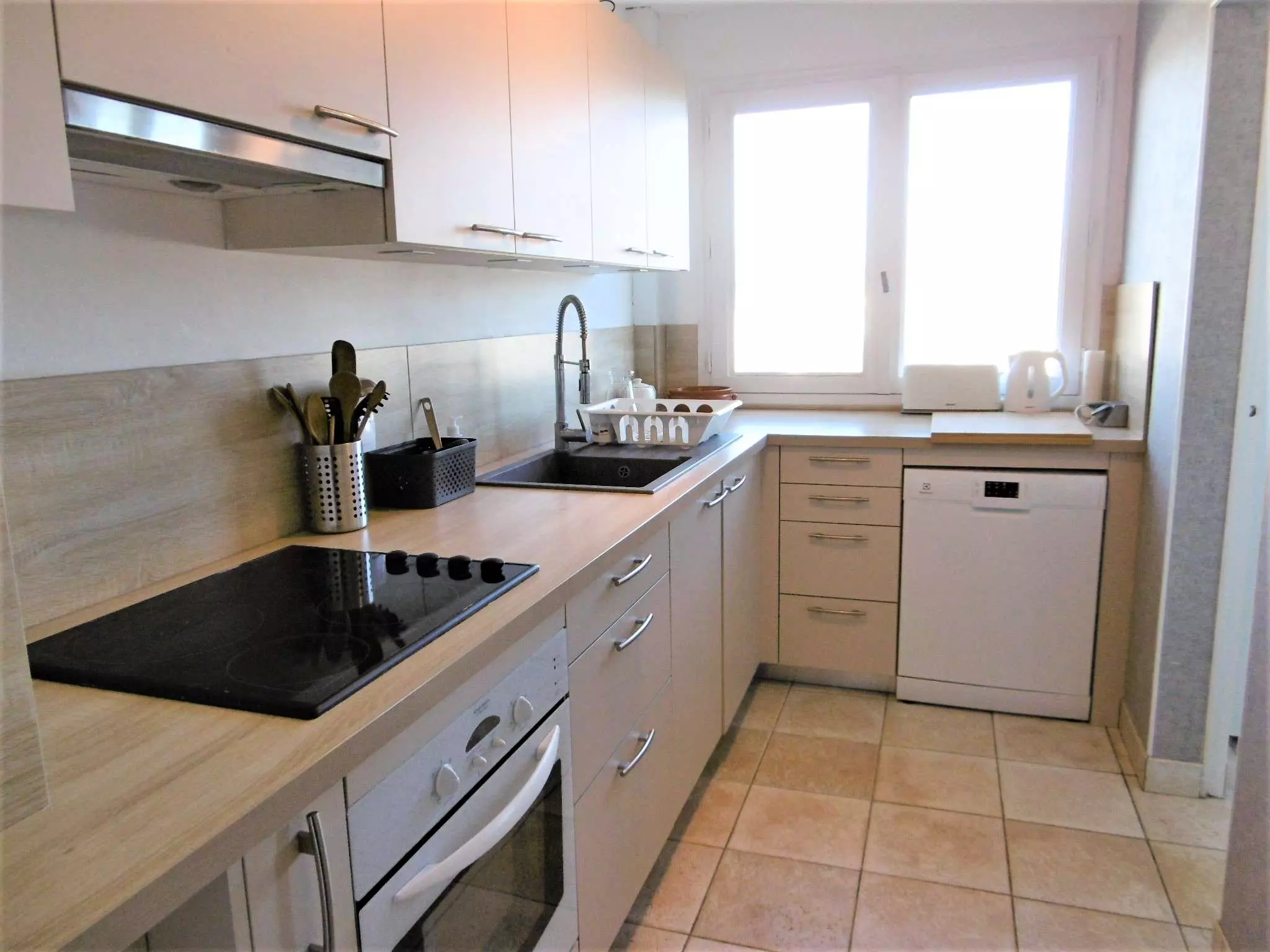 Equipement : réfrigérateur , four, micro-ondes, plaques vitrocéramiques, lave-vaisselle, lave-linge, cafetière, grille-pain, TV.