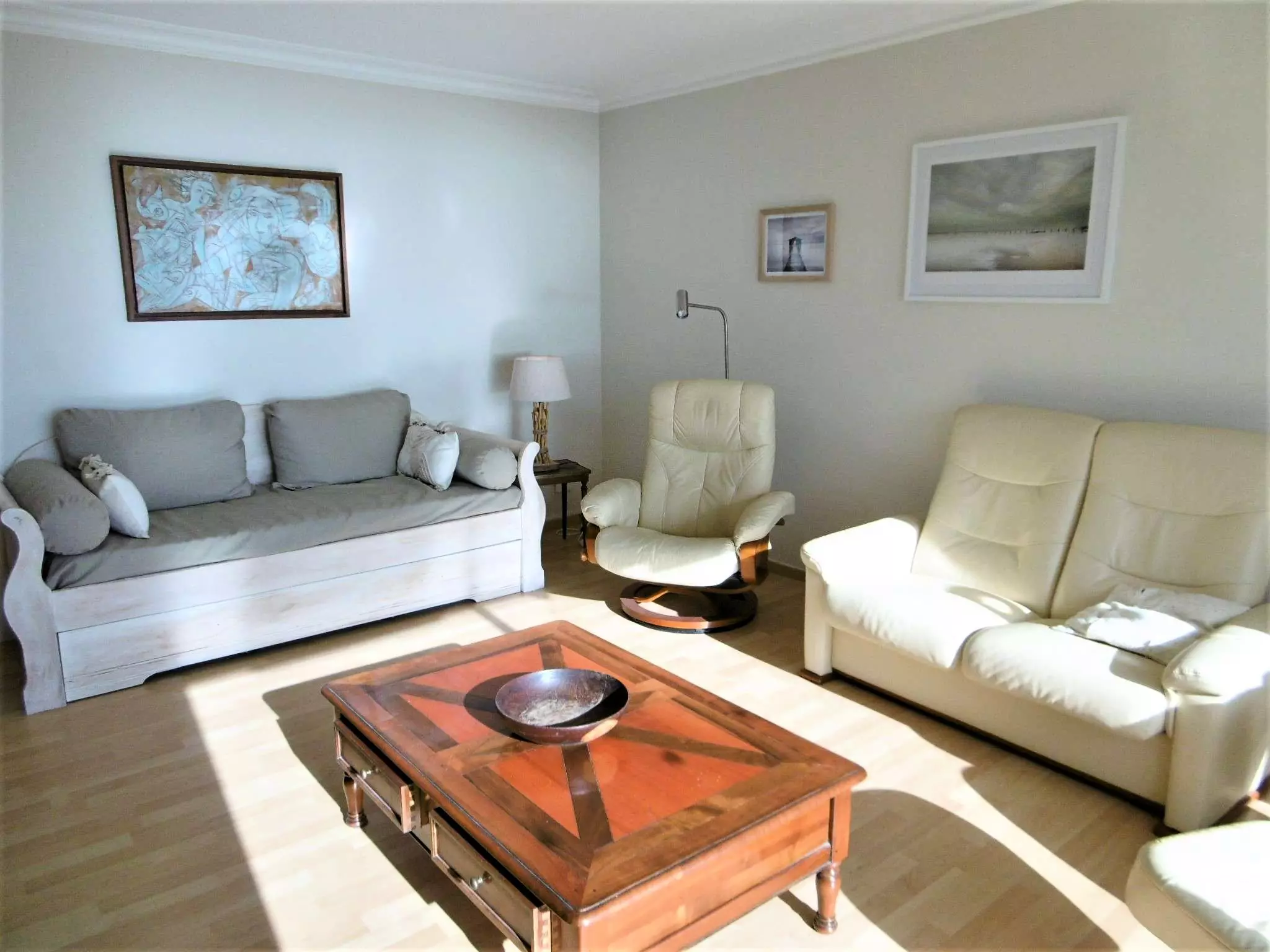 - Un salon avec 2 canapés et 2 fauteuils, avec 1 baie vitrée donnant sur le balcon vue mer