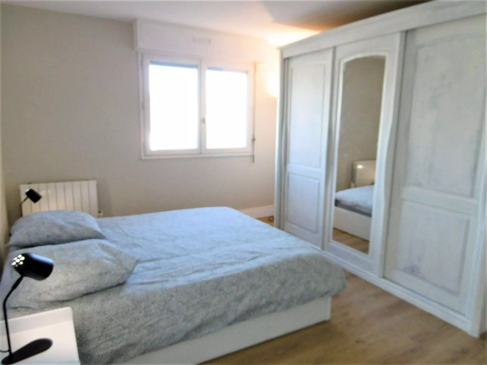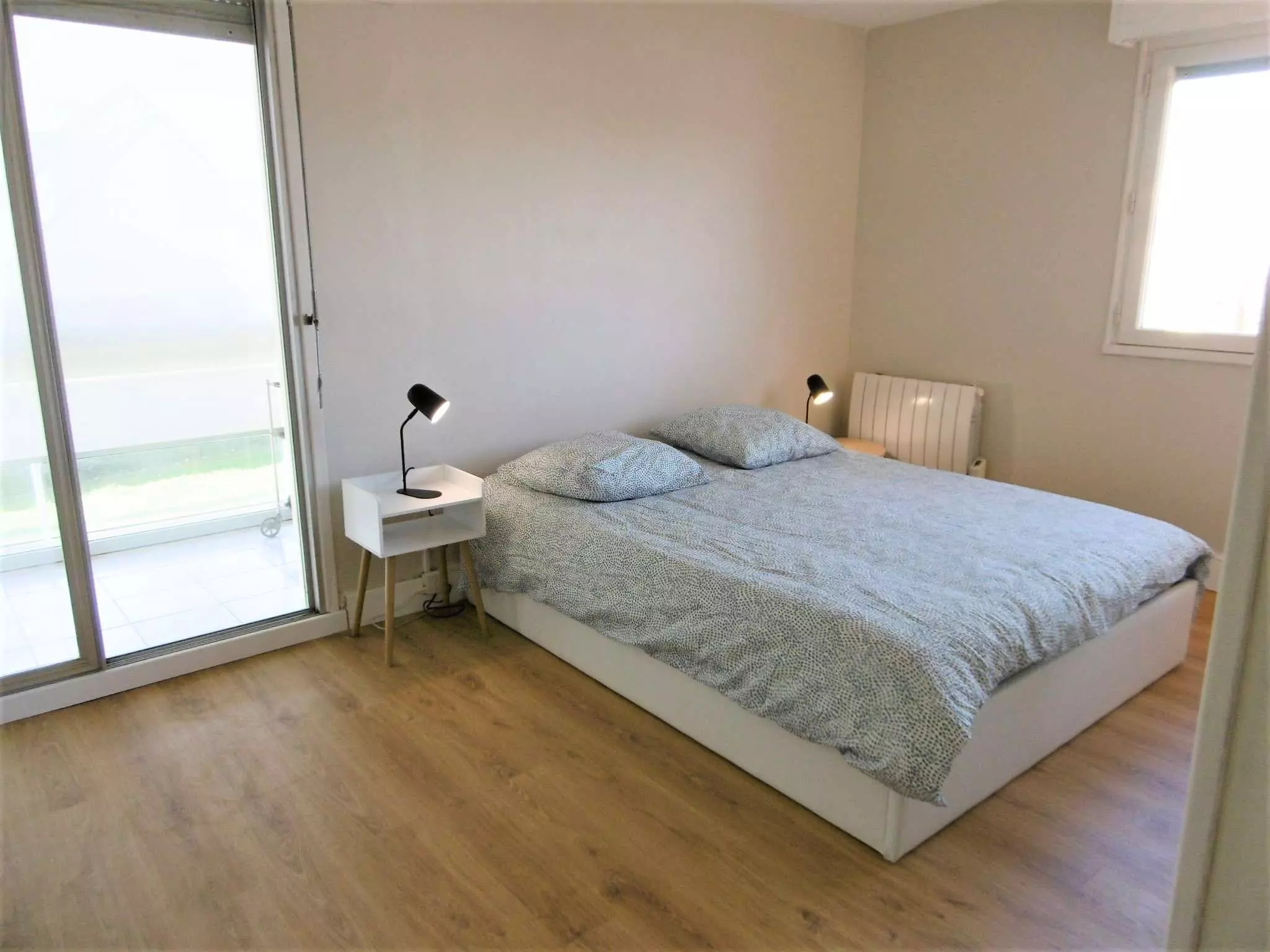 - Chambre 1 : 1 lit double en 160, grand placard - 1 baie vitrée avec accès sur le balcon vue jardin.