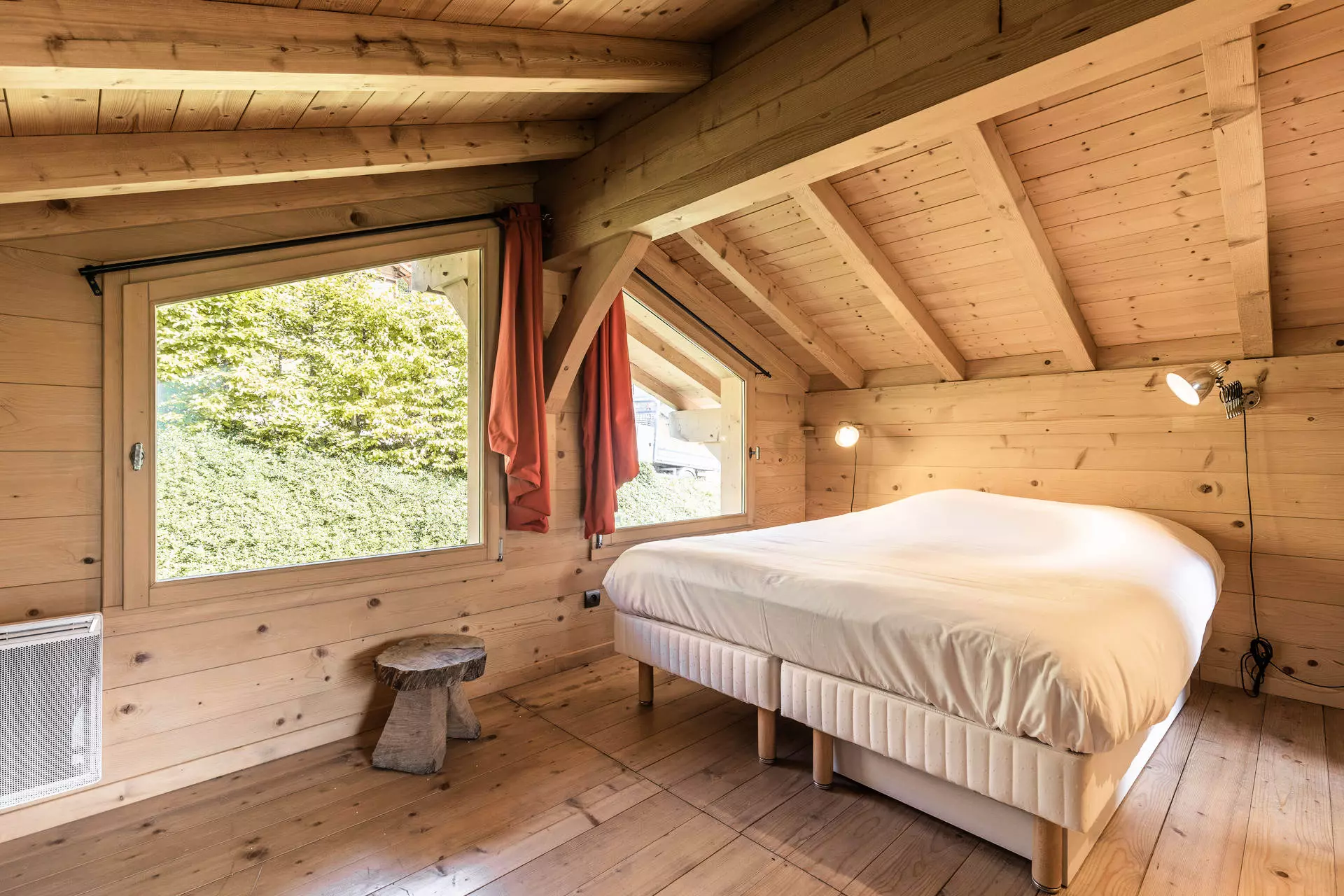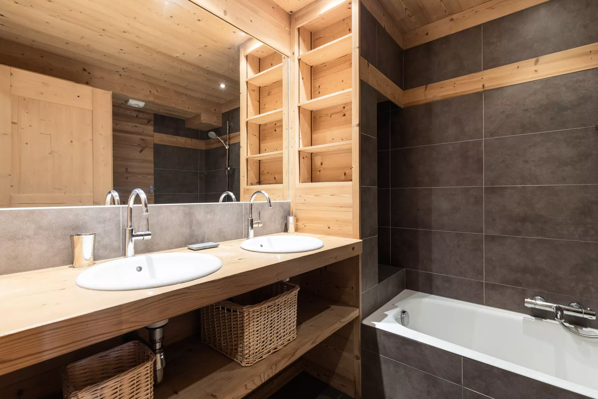 Dès l'entrée, un large hall dessert la mezzanine, aménagée en coin TV et lecture, d'où l'on profite d'une vue plongeante sur les montagnes. Ce niveau comprend également une chambre équipée d'un lit double (lit 160 cm) et de deux lits simples (90 cm), avec salle d'eau attenante (douche et WC) et fenêtre donnant sur l'arrière du chalet. Un ski-room situé dans le garage permet de ranger son matériel d'hiver.