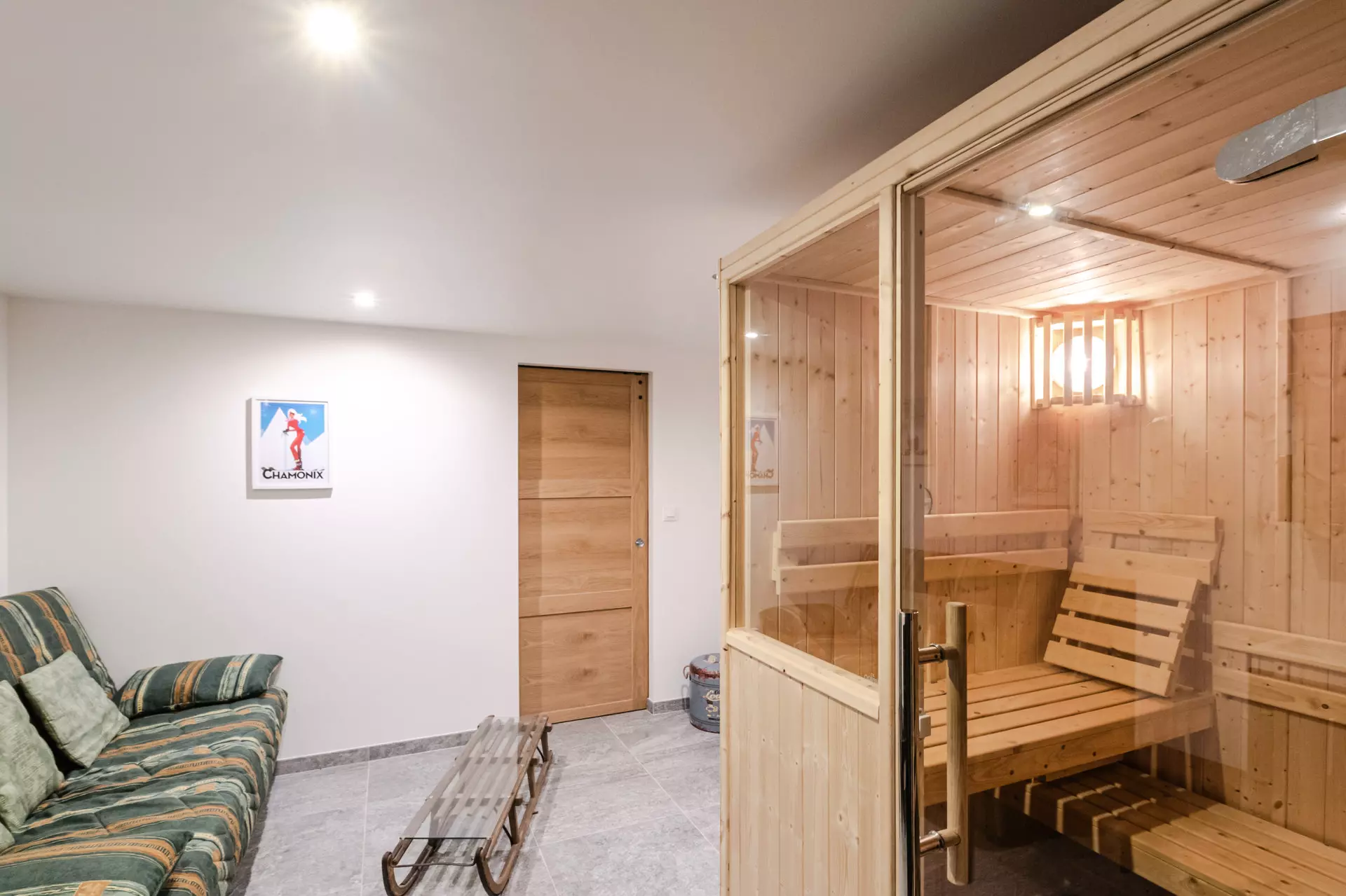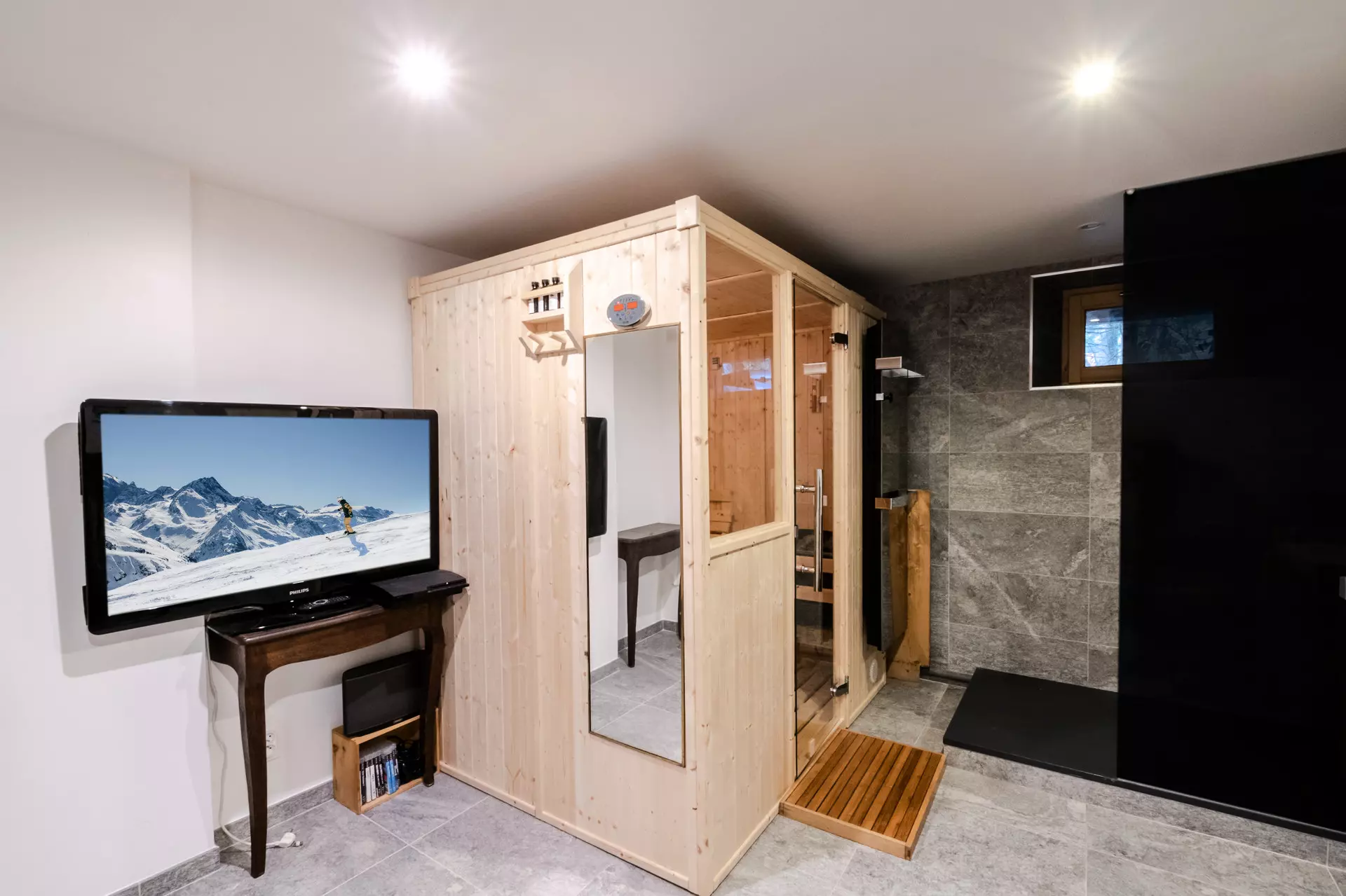 - Sauna avec douche, canapé et TV
